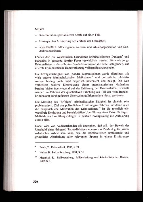 können dort die wesentlichen Grundsätze kriminalistischen Denkens* und Handelns in geradezu idealer Form verwirklicht werden. Für viele junge Kriminalisten ist deshalb eine Sonderkommission die erste Gelegenheit, das erlernte kriminalistische Handwerkszeug vollständig anzuwenden.