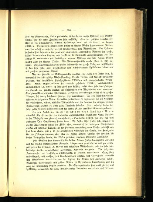 Aus der Familie der Doldengewächse wachsen eine Reihe von Arten hier, so namentlich der sehr giftige Wässerschierling, 6ieutn virosn, mit dreifach gefiederten Blättern, mit linealischen, scharfgezähnten Blättchen und quergefächerter Grundachse. 81um ÄUKnstätollnin hat einfach gefiederte Blätter; .ärelian^olien uredunAelica (A. «att'rn) ist sehr groß und kräftig, besitzt einen sehr durchdringenden Geruch, die Früchte werden zur Fabrikation von Wagenbitter usw. verwandt. Ein himmelblau blühender Ehrenpreis, Veronien kmwuknnxn, blüht oft in großen Wengen, sich durch kriechende Zweige sehr vermehrend. Zu den Aörbchenblütlern gehören die folgenden Arten: kotnsites potasltes (R. o/siemaLch hat im Frühjahr die zylindrischen, dichten, rötlichen Blutenstände und im Sommer die riesigen, sonnenschirmartigen Blätter, die öfter ganze Uferstücke bedecken. Starr aufrecht streben der hohe, gelbe Kanocio pnlnäosns und der bereits S. 25 f erwähnte 8onolms pnlustor.