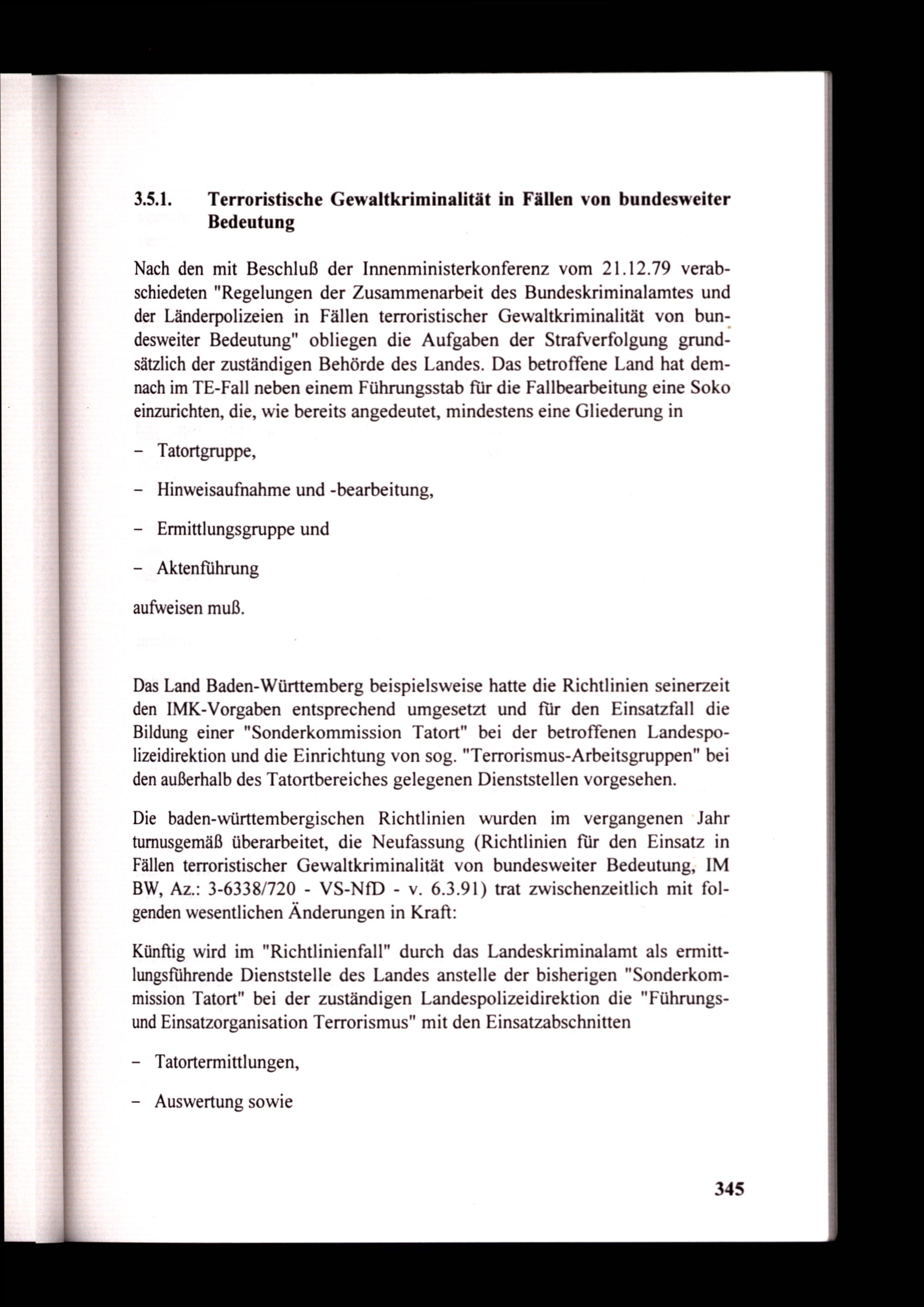 Das Land Baden-Württemberg beispielsweise hatte die Richtlinien seinerzeit den IMK-Vorgaben entsprechend umgesetzt und für den Einsatzfall die Bildung einer"Sonderkommission Tatort" bei der betroffenen Landespolizeidirektion und die Einrichtung von sog."Terrorismus-Arbeitsgruppen" bei den außerhalb des Tatortbereiches gelegenen Dienststellen vorgesehen.