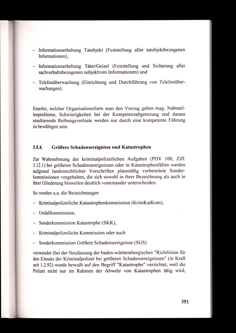 verwendet(bei der Neufassung der baden-württembergischen"Richtlinien für den Einsatz der Kriminalpolizei bei größeren Schadensereignissen"(in Kraft seit 1.2.92) wurde bewußt auf den Begriff"Katastrophe" verzichtet, weil die Polizei nicht nur im Rahmen der Abwehr von Katastrophen tätig wird,