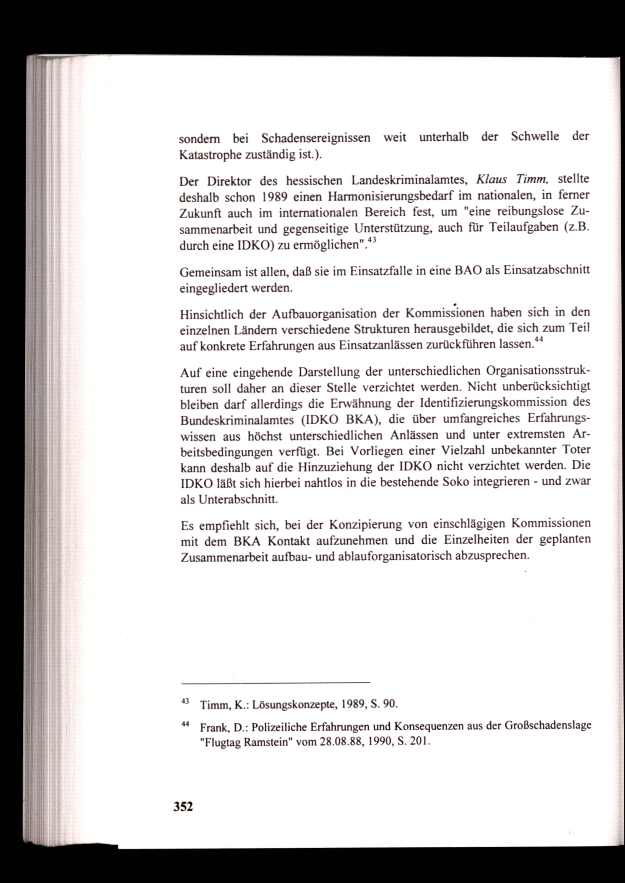 Auf eine eingehende Darstellung der unterschiedlichen Organisationsstrukturen soll daher an dieser Stelle verzichtet werden. Nicht unberücksichtigt bleiben darf allerdings die Erwähnung der Identifizierungskommission des Bundeskriminalamtes(IDKO BKA), die über umfangreiches Erfahrungswissen aus höchst unterschiedlichen Anlässen und unter extremsten Arbeitsbedingungen verfügt. Bei Vorliegen einer Vielzahl unbekannter Toter kann deshalb auf die Hinzuziehung der IDKO nicht verzichtet werden. Die IDKO läßt sich hierbei nahtlos in die bestehende Soko integrieren- und zwar als Unterabschnitt.