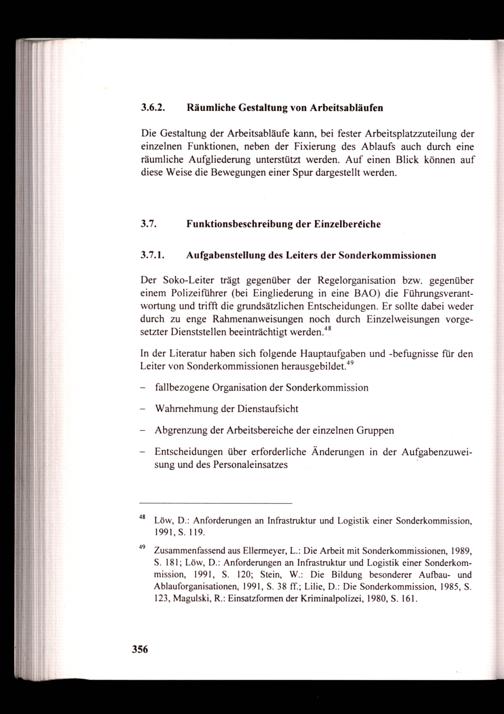 S. 181; Löw, D.: Anforderungen an Infrastruktur und Logistik einer Sonderkommission, 1991, S. 120; Stein, W.: Die Bildung besonderer Aufbau- und Ablauforganisationen, 1991, S. 38 ff.; Lilie, D.: Die Sonderkommission, 1985, S. 123, Magulski, R.: Einsatzformen der Kriminalpolizei, 1980, S. 161.