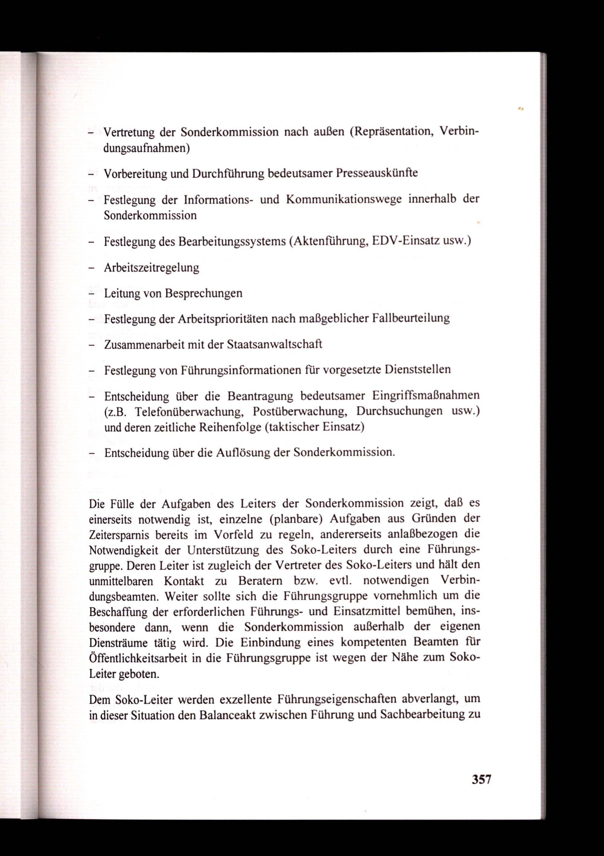 Die Fülle der Aufgaben des Leiters der Sonderkommission zeigt, daß es einerseits notwendig ist, einzelne(planbare) Aufgaben aus Gründen der Zeitersparnis bereits im Vorfeld zu regeln, andererseits anlaßbezogen die Notwendigkeit der Unterstützung des Soko-Leiters durch eine Führungsgruppe. Deren Leiter ist zugleich der Vertreter des Soko-Leiters und hält den unmittelbaren Kontakt zu Beratern bzw. evtl. notwendigen Verbindungsbeamten. Weiter sollte sich die Führungsgruppe vornehmlich um die Beschaffung der erforderlichen Führungs- und Einsatzmittel bemühen, insbesondere dann, wenn die Sonderkommission außerhalb der eigenen Diensträume tätig wird. Die Einbindung eines kompetenten Beamten für Öffentlichkeitsarbeit in die Führungsgruppe ist wegen der Nähe zum SokoLeiter geboten.