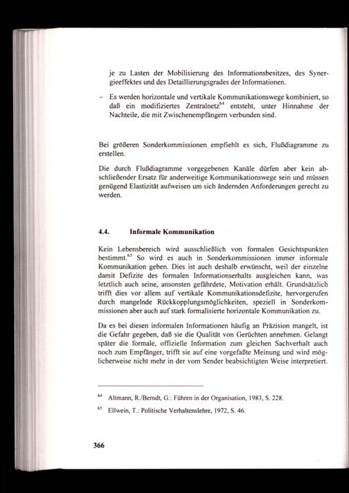 Kein Lebensbereich wird ausschließlich von formalen Gesichtspunkten bestimmt.°° So wird es auch in Sonderkommissionen immer informale Kommunikation geben. Dies ist auch deshalb erwünscht, weil der einzelne damit Defizite des formalen Informationserhalts ausgleichen kann, was letztlich auch seine, ansonsten gefährdete, Motivation erhält. Grundsätzlich trifft dies vor allem auf vertikale Kommunikationsdefizite, hervorgerufen durch mangelnde Rückkopplungsmöglichkeiten, speziell in Sonderkommissionen aber auch auf stark formalisierte horizontale Kommunikation zu.