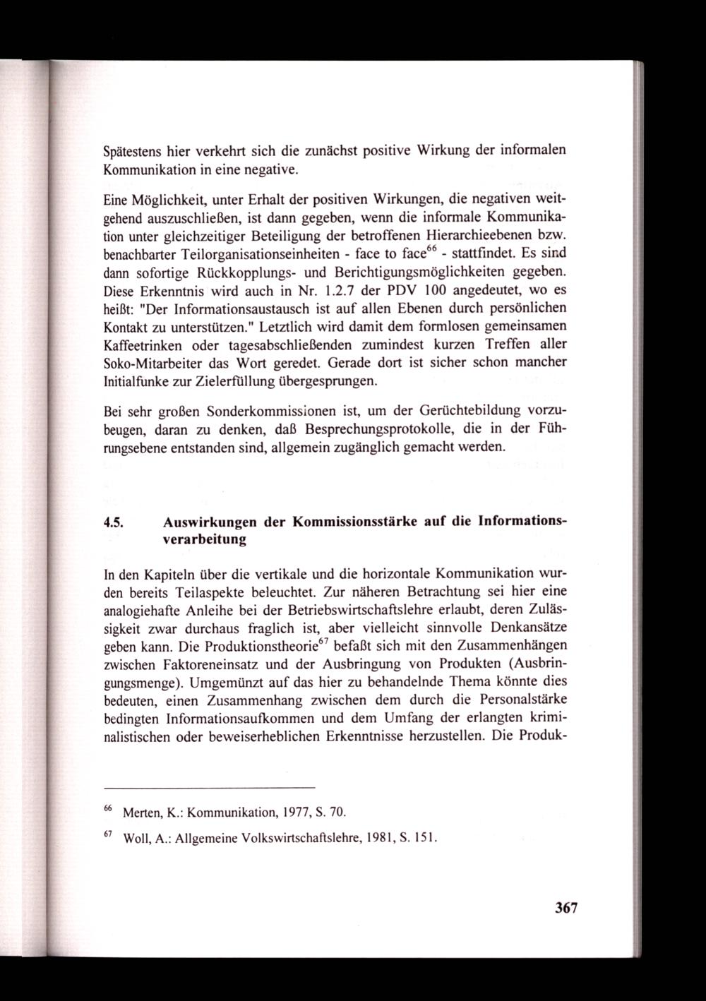 In den Kapiteln über die vertikale und die horizontale Kommunikation wurden bereits Teilaspekte beleuchtet. Zur näheren Betrachtung sei hier eine analogiehafte Anleihe bei der Betriebswirtschaftslehre erlaubt, deren Zulässigkeit zwar durchaus fraglich ist, aber vielleicht sinnvolle Denkansätze geben kann. Die Produktionstheorie®” befaßt sich mit den Zusammenhängen zwischen Faktoreneinsatz und der Ausbringung von Produkten(Ausbringungsmenge). Umgemünzt auf das hier zu behandelnde Thema könnte dies bedeuten, einen Zusammenhang zwischen dem durch die Personalstärke bedingten Informationsaufkommen und dem Umfang der erlangten kriminalistischen oder beweiserheblichen Erkenntnisse herzustellen. Die Produk