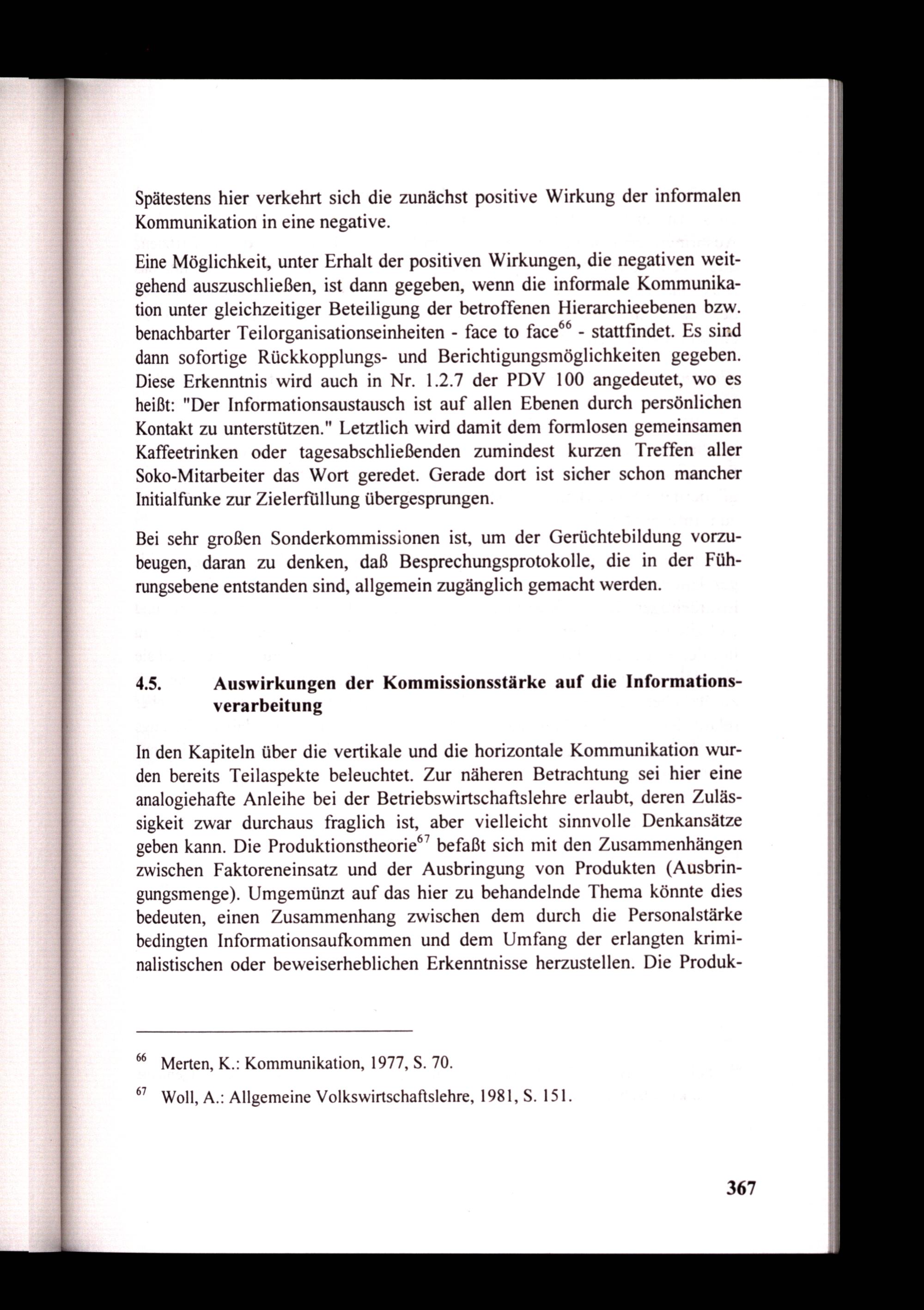 Eine Möglichkeit, unter Erhalt der positiven Wirkungen, die negativen weitgehend auszuschließen, ist dann gegeben, wenn die informale Kommunikation unter gleichzeitiger Beteiligung der betroffenen Hierarchieebenen bzw. benachbarter Teilorganisationseinheiten- face to face®®- stattfindet. Es sind dann sofortige Rückkopplungs- und Berichtigungsmöglichkeiten gegeben. Diese Erkenntnis wird auch in Nr. 1.2.7 der PDV 100 angedeutet, wo es heißt:"Der Informationsaustausch ist auf allen Ebenen durch persönlichen Kontakt zu unterstützen.” Letztlich wird damit dem formlosen gemeinsamen Kaffeetrinken oder tagesabschließenden zumindest kurzen Treffen aller Soko-Mitarbeiter das Wort geredet. Gerade dort ist sicher schon mancher Initialfunke zur Zielerfüllung übergesprungen.