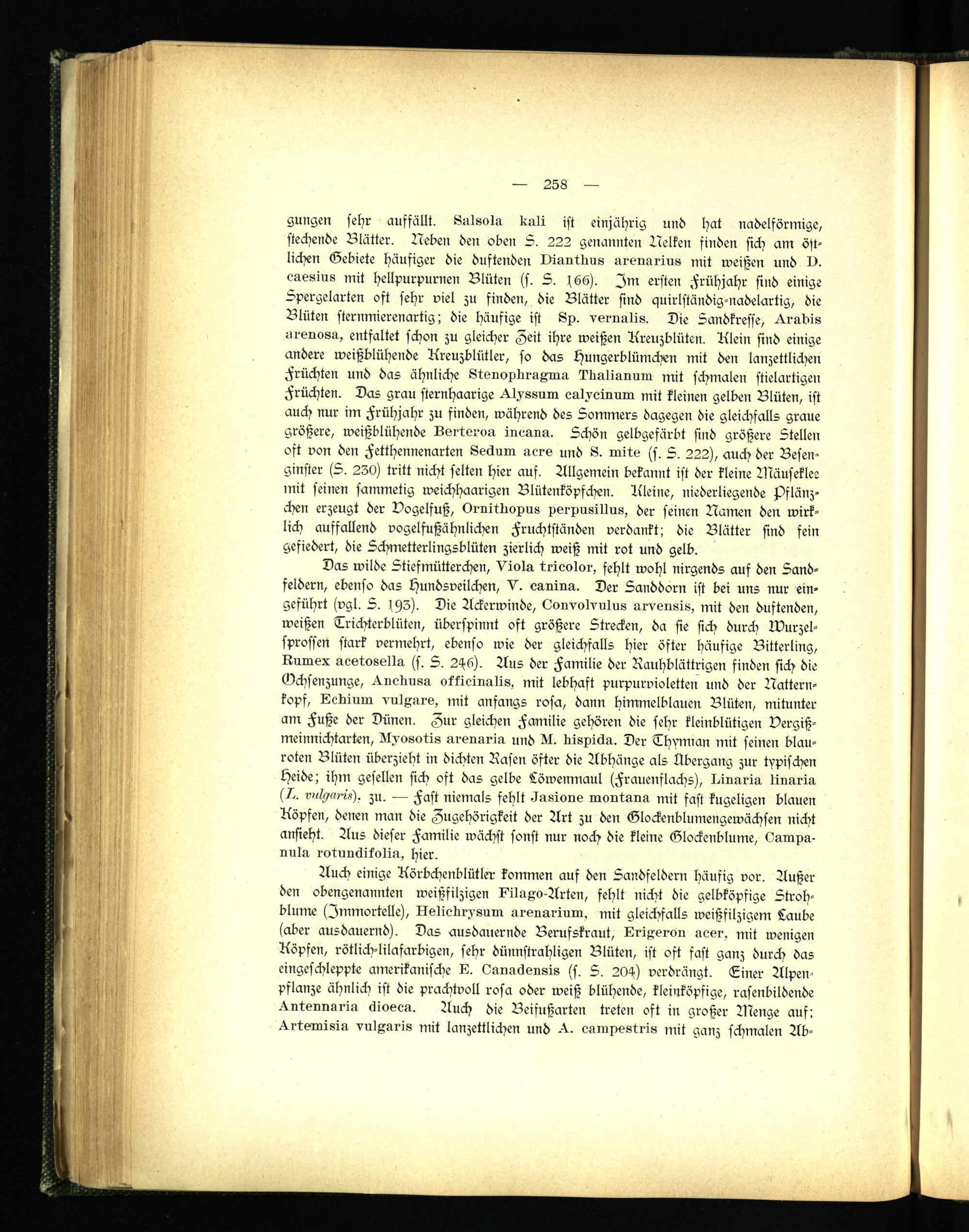 Auch einige Körbchenblütler kommen auf den Sandfeldern häufig vor. Außer den obengenannten weißfilzigen Vilugo-Arten, fehlt nicht die gelbköpfige Strohblume (Immortelle), Ooliebrysum arouurium, mit gleichfalls weißfilzigem Laube (aber ausdauernd). Das ausdauernde Berufskraut, Lrigeron ueor, mit wenigen Köpfen, rötlich-lilafarbigen, sehr dünnstrahligen Blüten, ist oft fast ganz durch das eingeschleppte amerikanische O. Oaimäonsis (f. S. 20H verdrängt. Tiner Alpenpflanze ähnlich ist die prachtvoll rosa oder weiß blühende, kleinköpfige, rasenbildende Vniommrm äioocu. Auch die Beifußarten treten oft in großer Nkenge auf; Vriowism vulgaris mit lanzettlichen und -V oampostris mit ganz schmalen Ab-