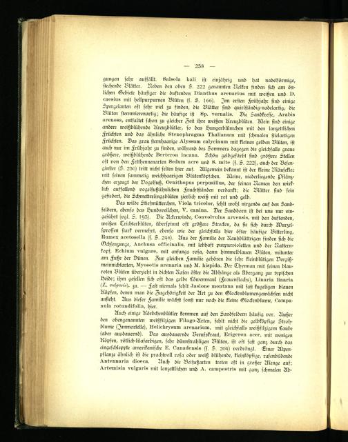 gungen sehr auffällt. Kulsolu Kuli ist einjährig und hat nadelförmige, stechende Blätter. Neben den oben S. 222 genannten Nelken finden sich am östlichen Gebiete häufiger die duftenden Omnibus urenurlu« mit weißen und I). euesius mit hellpurpurnen Blüten ff. 2. 166). Im ersten Frühjahr sind einige Spergelarten oft sehr viel zu finden, die Blätter sind quirlständig-nadelartig, die Blüten sternmierenartig; die häufige ist 8p. vernulis. Die Sandkrefse, Vrubl« UI- 6 U 08 L, entfaltet schon zu gleicher Zeit ihre weißen Kreuzblüten. Klein sind einige andere weißblühende Kreuzblütler, so das Hungerblümchen mit den lanzettlichen Früchten und das ähnliche 8isnopbru§mu Ibuliulluin mit schmalen stielartigen Früchten. Das grau sternhaarige .-Vlvssuin eulvoinnm mit kleinen gelben Blüten, ist auch nur im Frühjahr zu finden, während des Sommers dagegen die gleichfalls graue größere, weißblühende Bsi-terou iuounu. Schön gelbgefärbt sind größere Stellen oft von den Fetthennenarten 8eckuin uer« und 8. mite ff. S. 222), auch der Besenginster <S. 230) tritt nicht selten hier auf. Allgemein bekannt ist der kleine Btäusekler mit feinen sammetig weichhaarigen Blütenköpfchen. Kleine, niederliegende Pflänzchen erzeugt der Nogelfuß, Ornitbopus pei-pusillus, der seinen Namen den wirklich auffallend vogelfußähnlichen Fruchtständen verdankt; die Blätter sind fein gefiedert, die Schmetterlingsblüten zierlich weiß mit rot und gelb.