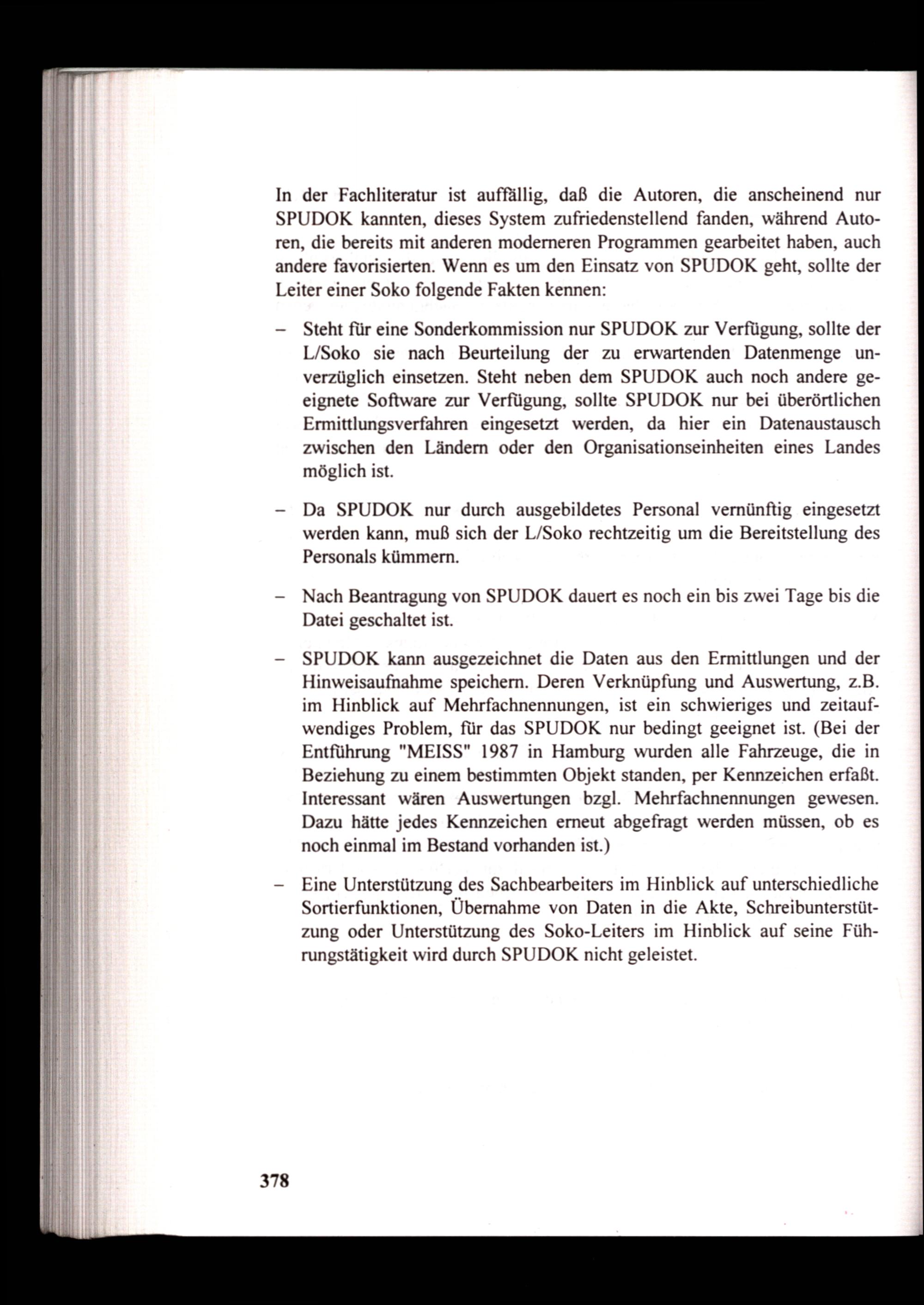 SPUDOK kann ausgezeichnet die Daten aus den Ermittlungen und der Hinweisaufnahme speichern. Deren Verknüpfung und Auswertung, z.B. im Hinblick auf Mehrfachnennungen, ist ein schwieriges und zeitaufwendiges Problem, für das SPUDOK nur bedingt geeignet ist.(Bei der Entführung"MEISS" 1987 in Hamburg wurden alle Fahrzeuge, die in Beziehung zu einem bestimmten Objekt standen, per Kennzeichen erfaßt. Interessant wären Auswertungen bzgl. Mehrfachnennungen gewesen. Dazu hätte jedes Kennzeichen erneut abgefragt werden müssen, ob es noch einmal im Bestand vorhanden ist.)