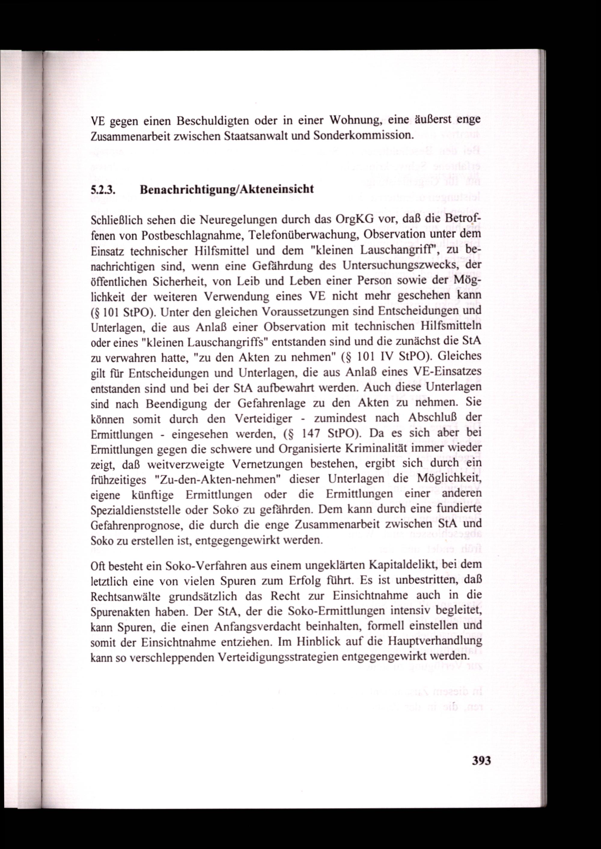 Schließlich sehen die Neuregelungen durch das OrgKG vor, daß die Betroffenen von Postbeschlagnahme, Telefonüberwachung, Observation unter dem Einsatz technischer Hilfsmittel und dem"kleinen Lauschangriff", zu benachrichtigen sind, wenn eine Gefährdung des Untersuchungszwecks, der öffentlichen Sicherheit, von Leib und Leben einer Person sowie der Möglichkeit der weiteren Verwendung eines VE nicht mehr geschehen kann (8 101 StPO). Unter den gleichen Voraussetzungen sind Entscheidungen und Unterlagen, die aus Anlaß einer Observation mit technischen Hilfsmitteln oder eines"kleinen Lauschangriffs" entstanden sind und die zunächst die StA zu verwahren hatte,"zu den Akten zu nehmen"($ 101 IV StPO). Gleiches gilt für Entscheidungen und Unterlagen, die aus Anlaß eines VE-Einsatzes entstanden sind und bei der StA aufbewahrt werden. Auch diese Unterlagen sind nach Beendigung der Gefahrenlage zu den Akten zu nehmen. Sie können somit durch den Verteidiger- zumindest nach Abschluß der Ermittlungen- eingesehen werden,($ 147 StPO). Da es sich aber bei Ermittlungen gegen die schwere und Organisierte Kriminalität immer wieder zeigt, daß weitverzweigte Vernetzungen bestehen, ergibt sich durch ein frühzeitiges"Zu-den-Akten-nehmen" dieser Unterlagen die Möglichkeit, eigene künftige Ermittlungen oder die Ermittlungen einer anderen Spezialdienststelle oder Soko zu gefährden. Dem kann durch eine fundierte Gefahrenprognose, die durch die enge Zusammenarbeit zwischen StA und Soko zu erstellen ist, entgegengewirkt werden.