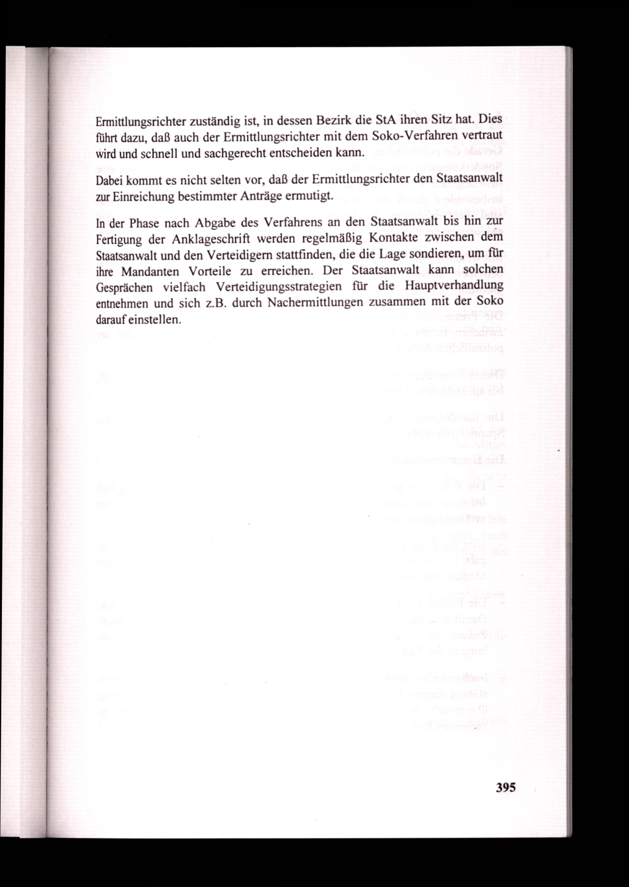 In der Phase nach Abgabe des Verfahrens an den Staatsanwalt bis hin zur Fertigung der Anklageschrift werden regelmäßig Kontakte zwischen dem Staatsanwalt und den Verteidigern stattfinden, die die Lage sondieren, um für ihre Mandanten Vorteile zu erreichen. Der Staatsanwalt kann solchen Gesprächen vielfach Verteidigungsstrategien für die Hauptverhandlung entnehmen und sich z.B. durch Nachermittlungen zusammen mit der Soko darauf einstellen.