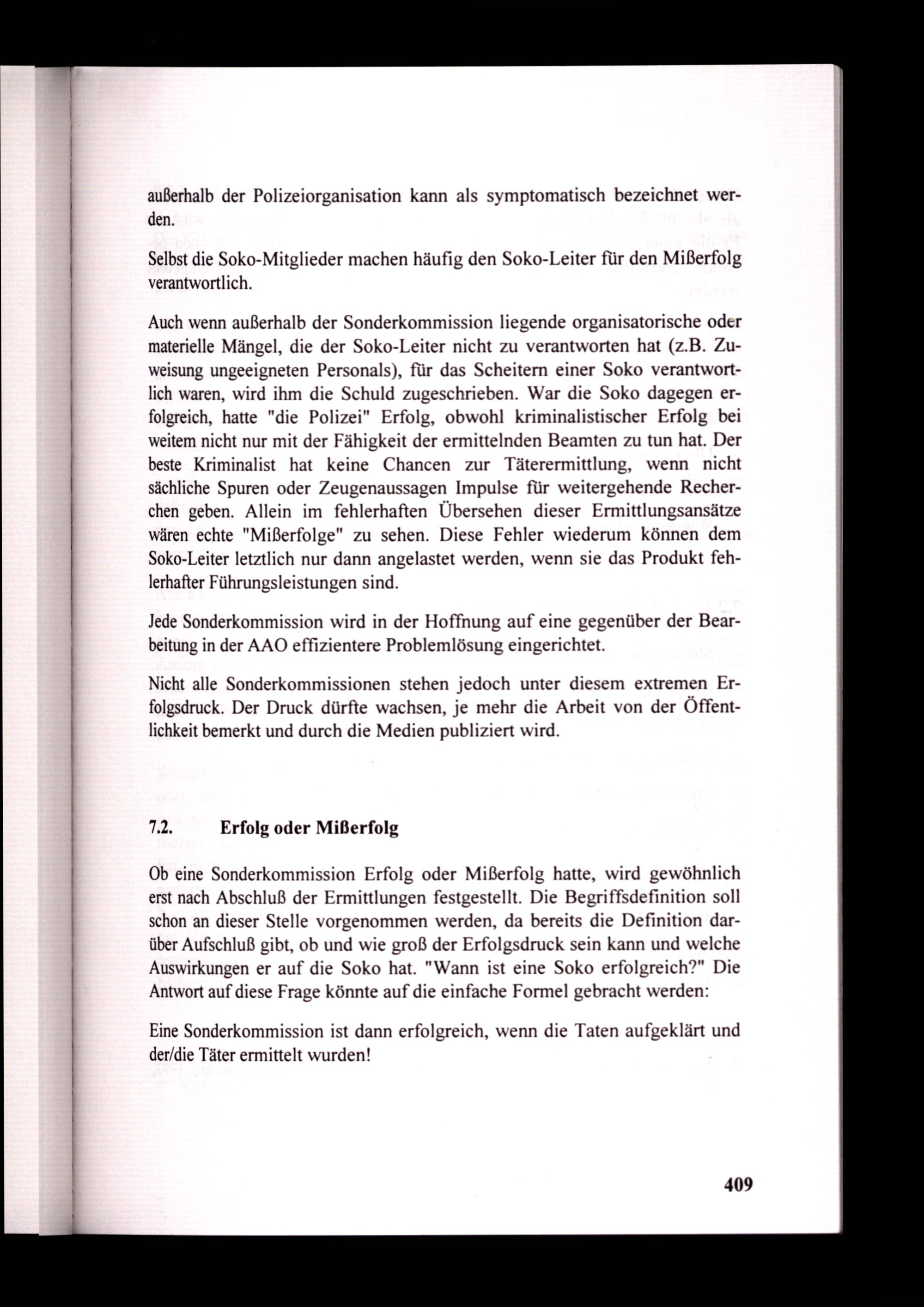 Auch wenn außerhalb der Sonderkommission liegende organisatorische oder materielle Mängel, die der Soko-Leiter nicht zu verantworten hat(z.B. Zuweisung ungeeigneten Personals), für das Scheitern einer Soko verantwortlich waren, wird ihm die Schuld zugeschrieben. War die Soko dagegen erfolgreich, hatte"die Polizei” Erfolg, obwohl kriminalistischer Erfolg bei weitem nicht nur mit der Fähigkeit der ermittelnden Beamten zu tun hat. Der beste Kriminalist hat keine Chancen zur Täterermittlung, wenn nicht sächliche Spuren oder Zeugenaussagen Impulse für weitergehende Recherchen geben. Allein im fehlerhaften Übersehen dieser Ermittlungsansätze wären echte"Mißerfolge" zu sehen. Diese Fehler wiederum können dem Soko-Leiter letztlich nur dann angelastet werden, wenn sie das Produkt fehlerhafter Führungsleistungen sind.
