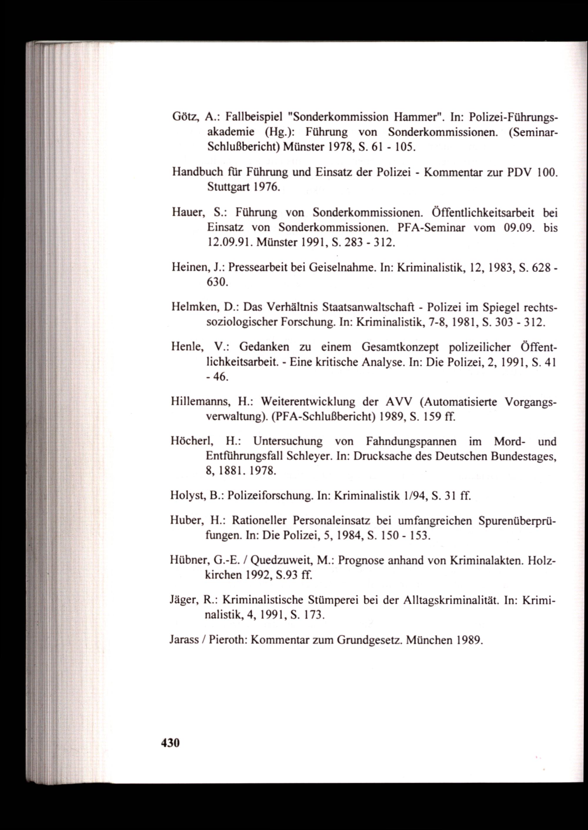 Hauer, S.: Führung von Sonderkommissionen. Öffentlichkeitsarbeit bei Einsatz von Sonderkommissionen. PFA-Seminar vom 09.09. bis 12.09.91. Münster 1991, S. 283- 312.
