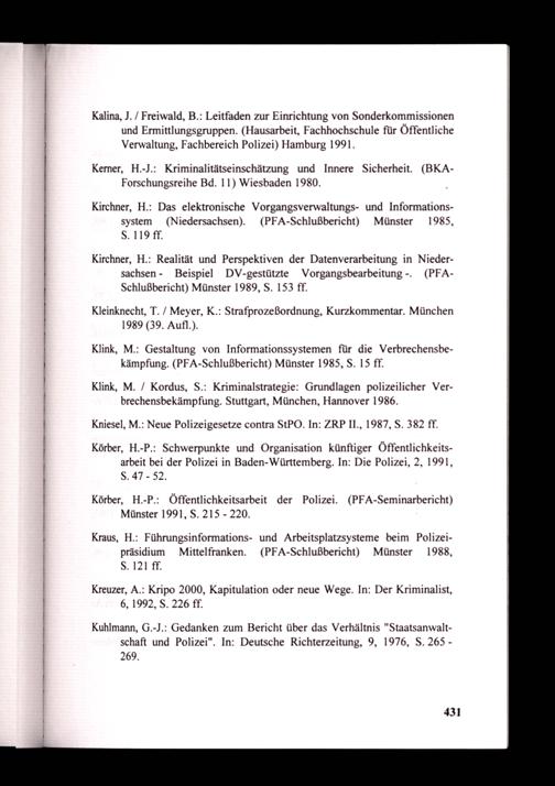 Kalina, J./ Freiwald, B.: Leitfaden zur Einrichtung von Sonderkommissionen und Ermittlungsgruppen.(Hausarbeit, Fachhochschule für Öffentliche Verwaltung, Fachbereich Polizei) Hamburg 1991.