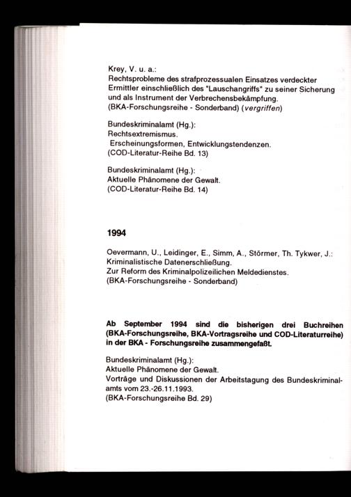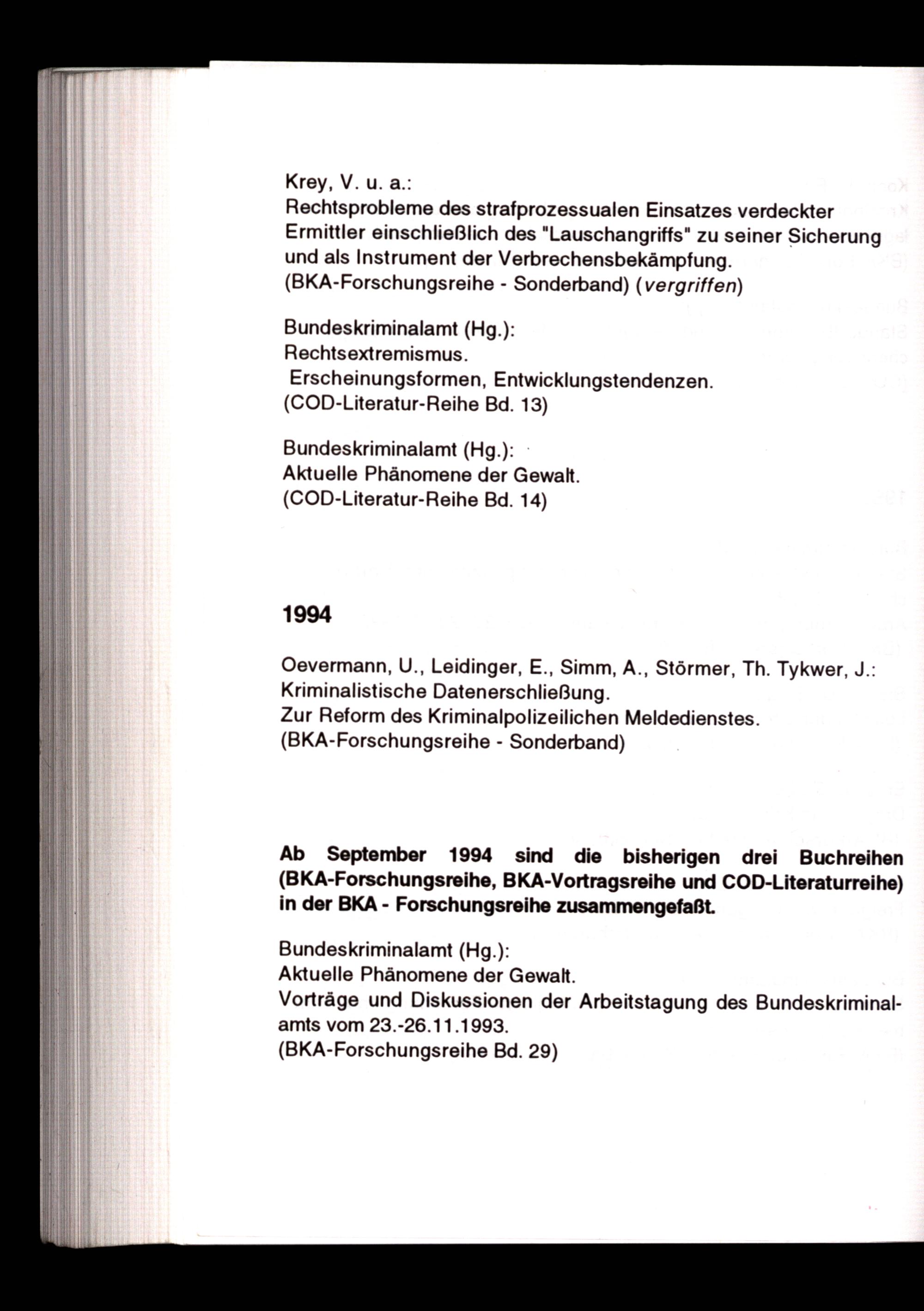 Ab September 1994 sind die bisherigen drei Buchreihen (BKA-Forschungsreihe, BKA-Vortragsreihe und COD-Literaturreihe) in der BKA- Forschungsreihe zusammengefaßt.