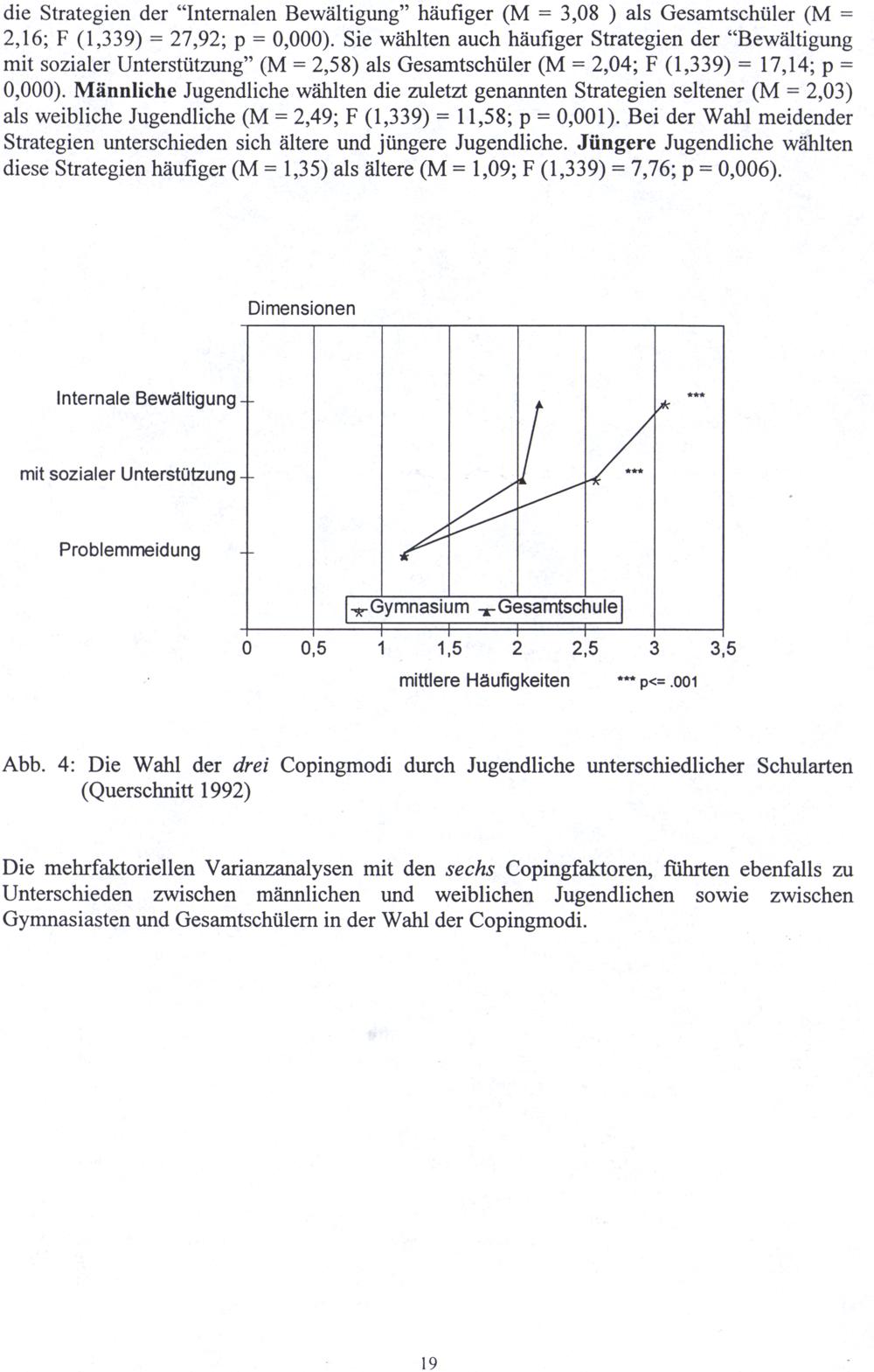 Die mehrfaktoriellen Varianzanalysen mit den sechs Copingfaktoren, führten ebenfalls zu Unterschieden zwischen männlichen und weiblichen Jugendlichen sowie zwischen Gymnasiasten und Gesamtschülern in der Wahl der Copingmodi.
