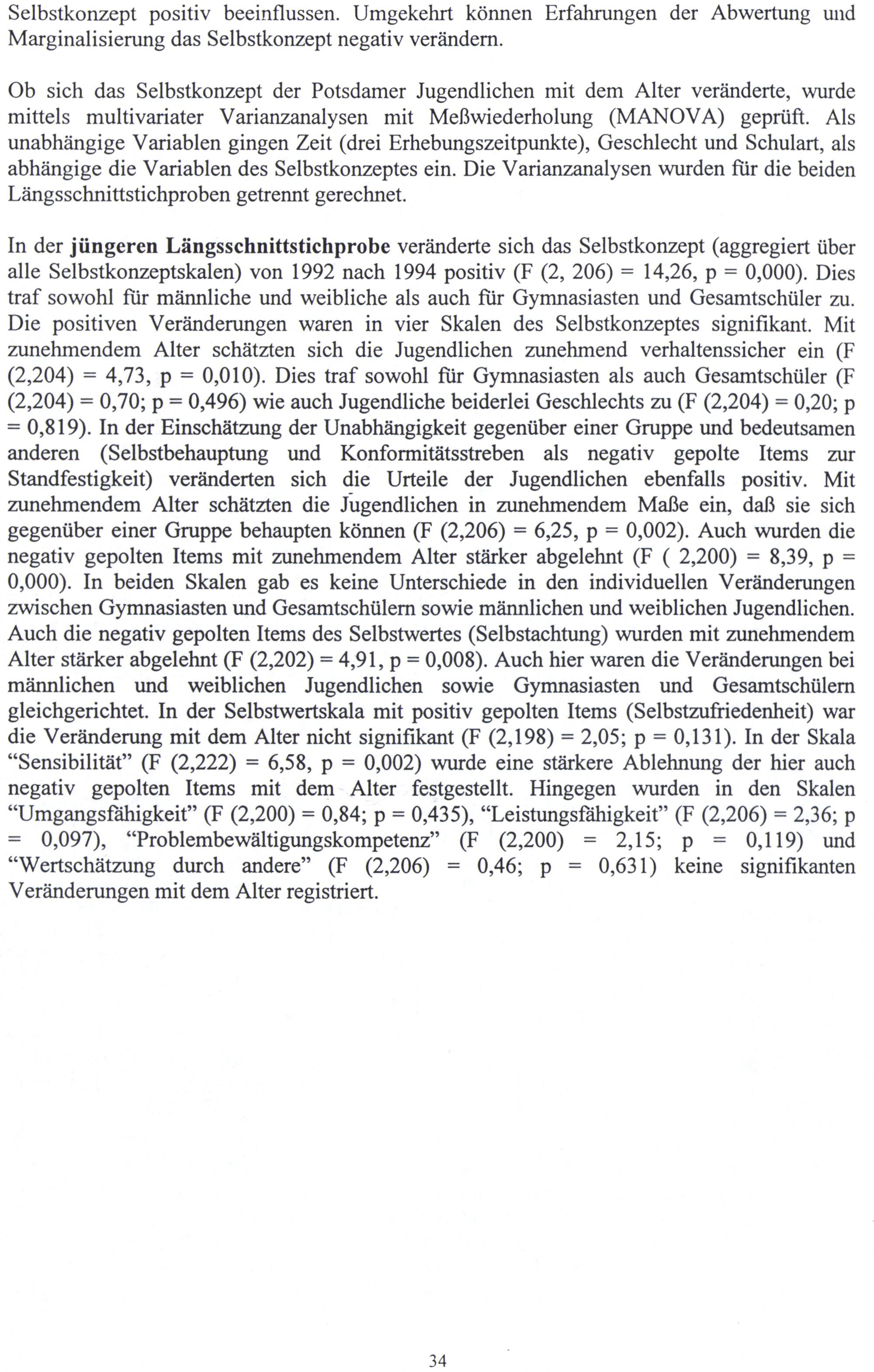 In der jüngeren Längsschnittstichprobe veränderte sich das Selbstkonzept(aggregiert über alle Selbstkonzeptskalen) von 1992 nach 1994 positiv(F(2, 206)= 14,26, p= 0,000). Dies traf sowohl für männliche und weibliche als auch für Gymnasiasten und Gesamtschüler zu. Die positiven Veränderungen waren in vier Skalen des Selbstkonzeptes signifikant. Mit zunehmendem Alter schätzten sich die Jugendlichen zunehmend verhaltenssicher ein(F (2,204)= 4,73, p= 0,010). Dies traf sowohl für Gymnasiasten als auch Gesamtschüler(F (2,204)= 0,70; p= 0,496) wie auch Jugendliche beiderlei Geschlechts zu(F(2,204)= 0,20; p = 0,819). In der Einschätzung der Unabhängigkeit gegenüber einer Gruppe und bedeutsamen anderen(Selbstbehauptung und Konformitätsstreben als negativ gepolte Items zur Standfestigkeit) veränderten sich die Urteile der Jugendlichen ebenfalls positiv. Mit zunehmendem Alter schätzten die Jugendlichen in zunehmendem Maße ein, daß sie sich gegenüber einer Gruppe behaupten können(F(2,206)= 6,25, p= 0,002). Auch wurden die negativ gepolten Items mit zunehmendem Alter stärker abgelehnt(F( 2,200)= 8,39, p= 0,000). In beiden Skalen gab es keine Unterschiede in den individuellen Veränderungen zwischen Gymnasiasten und Gesamtschülern sowie männlichen und weiblichen Jugendlichen. Auch die negativ gepolten Items des Selbstwertes(Selbstachtung) wurden mit zunehmendem Alter stärker abgelehnt(F(2,202)= 4,91, p= 0,008). Auch hier waren die Veränderungen bei männlichen und weiblichen Jugendlichen sowie Gymnasiasten und Gesamtschülern gleichgerichtet. In der Selbstwertskala mit positiv gepolten Items(Selbstzufriedenheit) war die Veränderung mit dem Alter nicht signifikant(F(2,198)= 2,05; p= 0,131). In der Skala “Sensibilität”(F(2,222)= 6,58, p= 0,002) wurde eine stärkere Ablehnung der hier auch negativ gepolten Items mit dem Alter festgestellt. Hingegen wurden in den Skalen “Umgangsfähigkeit”(F(2,200)= 0,84; p= 0,435),“Leistungsfähigkeit”(F(2,206)= 2,36; p = 0,097),“Problembewältigungskompetenz”(F(2,200)= 2,15; p= 0,119) und “Wertschätzung durch andere”(F(2,206)= 0,46; p= 0,631) keine signifikanten Veränderungen mit dem Alter registriert.