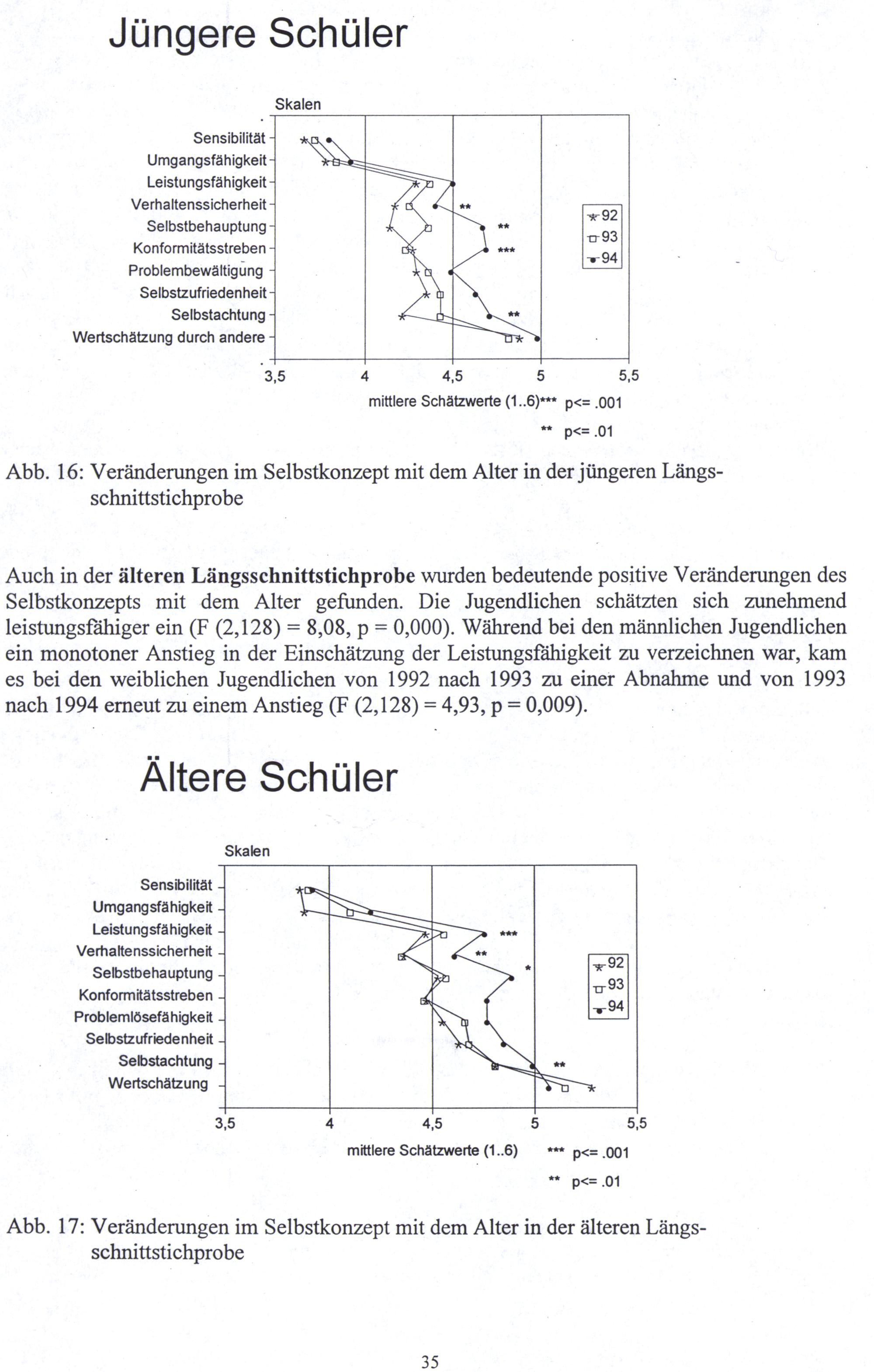 Auch in der älteren Längsschnittstichprobe wurden bedeutende positive Veränderungen des Selbstkonzepts mit dem Alter gefunden. Die Jugendlichen schätzten sich zunehmend leistungsfähiger ein(F(2,128)= 8,08, p= 0,000). Während bei den männlichen Jugendlichen ein monotoner Anstieg in der Einschätzung der Leistungsfähigkeit zu verzeichnen war, kam es bei den weiblichen Jugendlichen von 1992 nach 1993 zu einer Abnahme und von 1993 nach 1994 erneut zu einem Anstieg(F(2,128)= 4,93, p= 0,009).