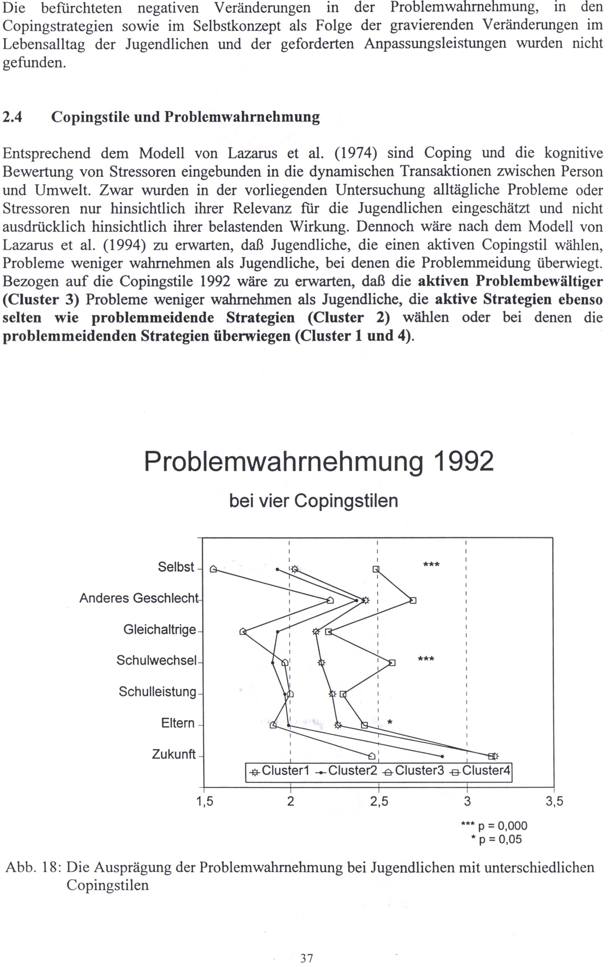 Entsprechend dem Modell von Lazarus et al.(1974) sind Coping und die kognitive Bewertung von Stressoren eingebunden in die dynamischen Transaktionen zwischen Person und Umwelt. Zwar wurden in der vorliegenden Untersuchung alltägliche Probleme oder Stressoren nur hinsichtlich ihrer Relevanz für die Jugendlichen eingeschätzt und nicht ausdrücklich hinsichtlich ihrer belastenden Wirkung. Dennoch wäre nach dem Modell von Lazarus et al.(1994) zu erwarten, daß Jugendliche, die einen aktiven Copingstil wählen, Probleme weniger wahrnehmen als Jugendliche, bei denen die Problemmeidung überwiegt. Bezogen auf die Copingstile 1992 wäre zu erwarten, daß die aktiven Problembewältiger (Cluster 3) Probleme weniger wahrnehmen als Jugendliche, die aktive Strategien ebenso selten wie problemmeidende Strategien(Cluster 2) wählen oder bei denen die problemmeidenden Strategien überwiegen(Cluster 1 und 4).