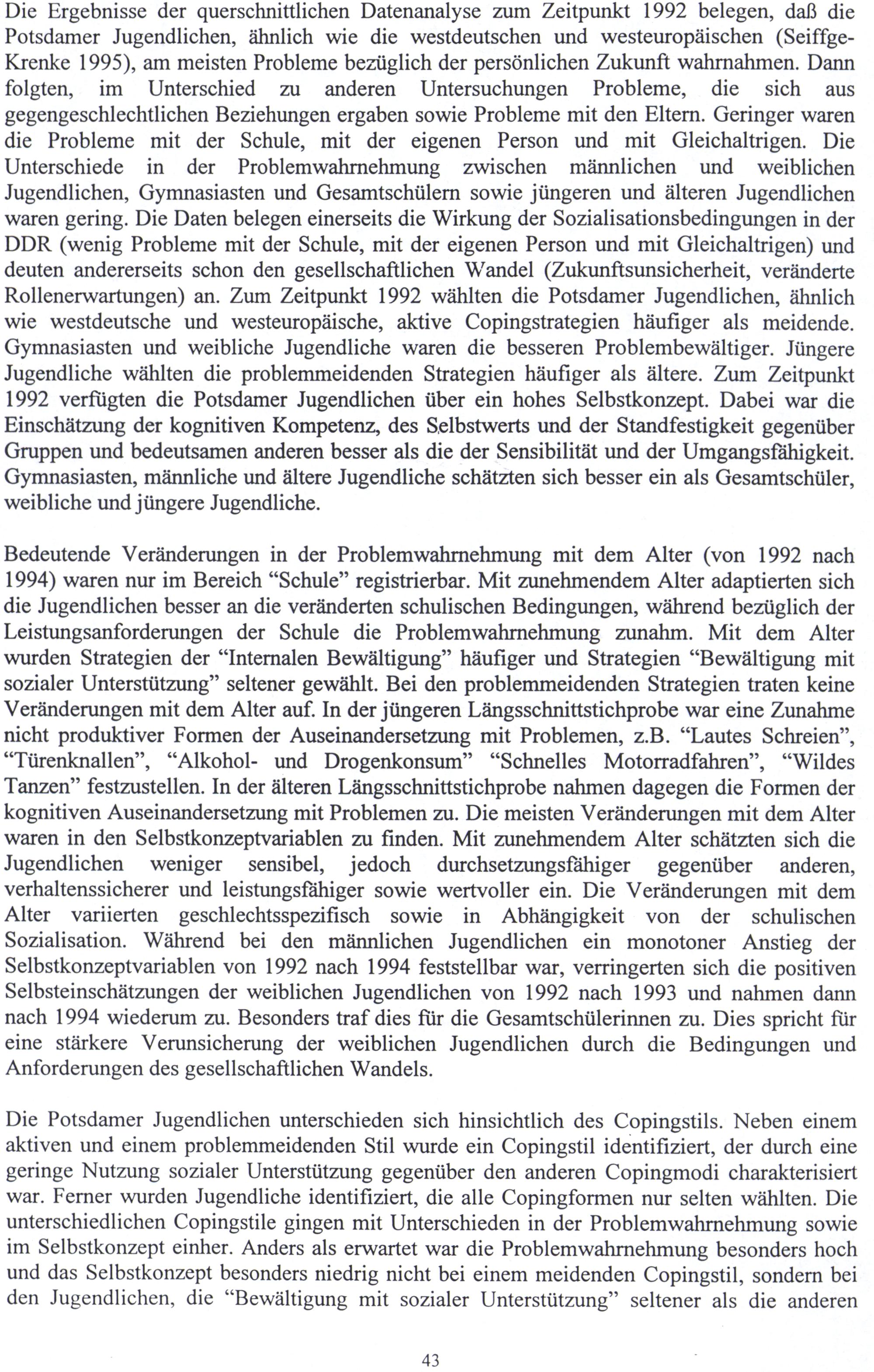 Die Ergebnisse der querschnittlichen Datenanalyse zum Zeitpunkt 1992 belegen, daß die Potsdamer Jugendlichen, ähnlich wie die westdeutschen und westeuropäischen(SeiffgeKrenke 1995), am meisten Probleme bezüglich der persönlichen Zukunft wahrnahmen. Dann folgten, im Unterschied zu anderen Untersuchungen Probleme, die sich aus gegengeschlechtlichen Beziehungen ergaben sowie Probleme mit den Eltern. Geringer waren die Probleme mit der Schule, mit der eigenen Person und mit Gileichaltrigen. Die Unterschiede in der Problemwahrnehmung zwischen männlichen und weiblichen Jugendlichen, Gymnasiasten und Gesamtschülern sowie jüngeren und älteren Jugendlichen waren gering. Die Daten belegen einerseits die Wirkung der Sozialisationsbedingungen in der DDR(wenig Probleme mit der Schule, mit der eigenen Person und mit Gleichaltrigen) und deuten andererseits schon den gesellschaftlichen Wandel(Zukunftsunsicherheit, veränderte Rollenerwartungen) an. Zum Zeitpunkt 1992 wählten die Potsdamer Jugendlichen, ähnlich wie westdeutsche und westeuropäische, aktive Copingstrategien häufiger als meidende. Gymnasiasten und weibliche Jugendliche waren die besseren Problembewältiger. Jüngere Jugendliche wählten die problemmeidenden Strategien häufiger als ältere. Zum Zeitpunkt 1992 verfügten die Potsdamer Jugendlichen über ein hohes Selbstkonzept. Dabei war die Einschätzung der kognitiven Kompetenz, des Selbstwerts und der Standfestigkeit gegenüber Gruppen und bedeutsamen anderen besser als die der Sensibilität und der Umgangsfähigkeit. Gymnasiasten, männliche und ältere Jugendliche schätzten sich besser ein als Gesamtschüler, weibliche und jüngere Jugendliche.