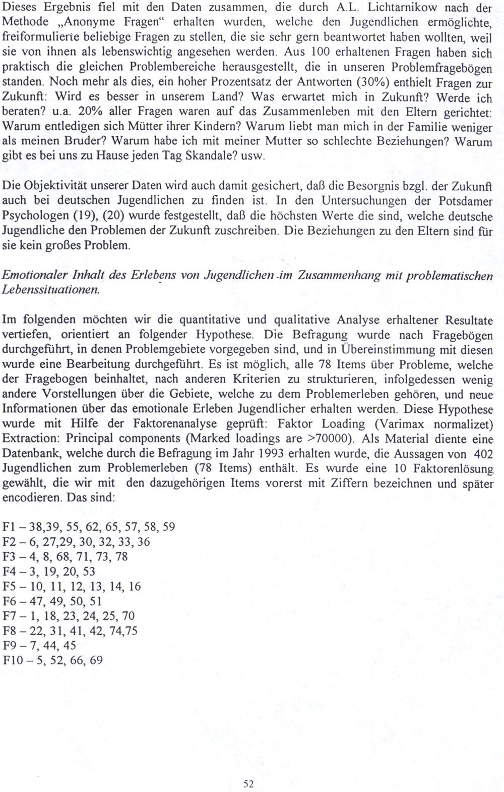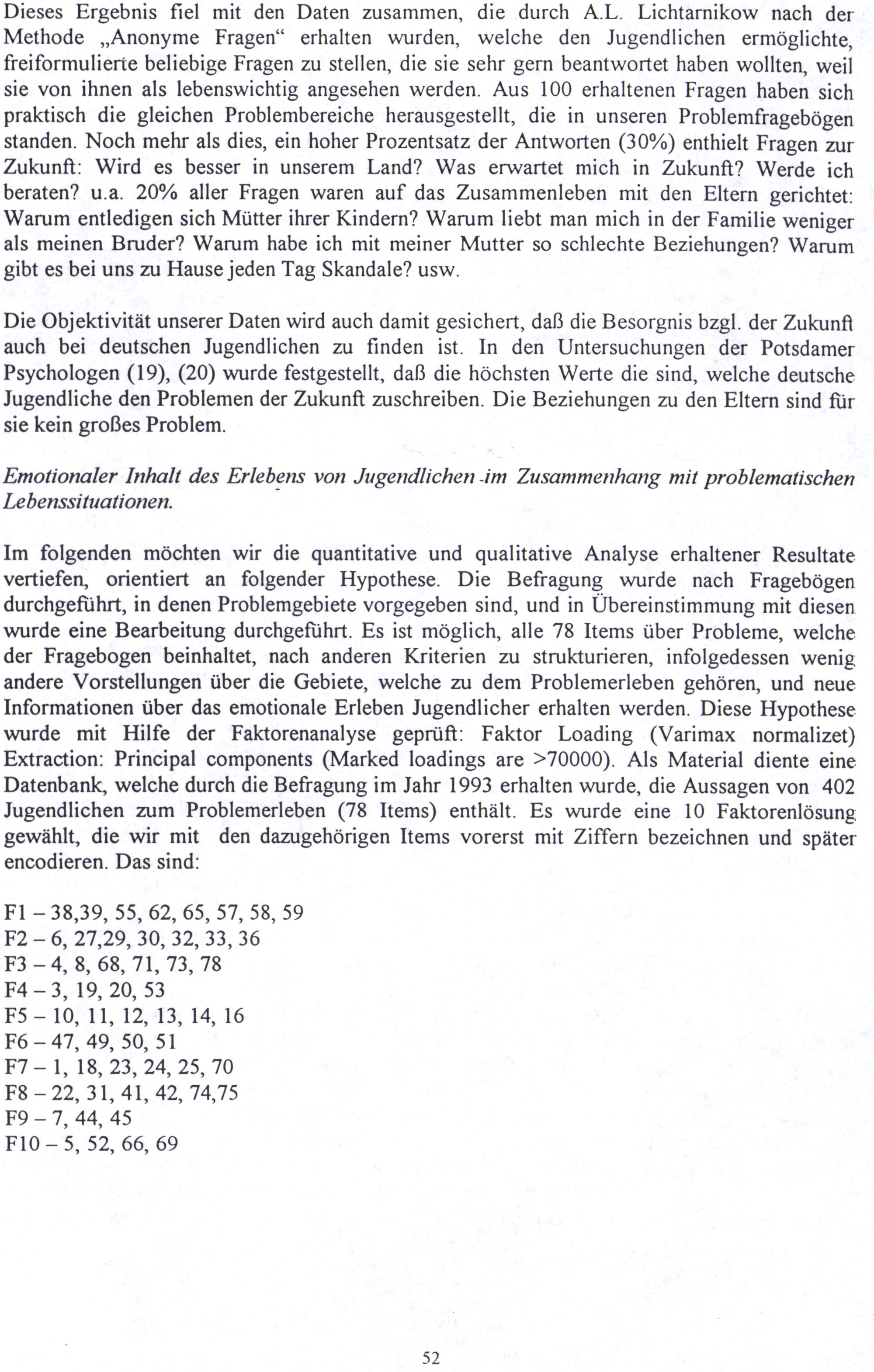 Im folgenden möchten wir die quantitative und qualitative Analyse erhaltener Resultate vertiefen, orientiert an folgender Hypothese. Die Befragung wurde nach Fragebögen durchgeführt, in denen Problemgebiete vorgegeben sind, und in Übereinstimmung mit diesen wurde eine Bearbeitung durchgeführt. Es ist möglich, alle 78 Items über Probleme, welche der Fragebogen beinhaltet, nach anderen Kriterien zu strukturieren, infolgedessen wenig andere Vorstellungen über die Gebiete, welche zu dem Problemerleben gehören, und neue Informationen über das emotionale Erleben Jugendlicher erhalten werden. Diese Hypothese wurde mit Hilfe der Faktorenanalyse geprüft: Faktor Loading(Varimax normalizet) Extraction: Principal components(Marked loadings are>70000). Als Material diente eine Datenbank, welche durch die Befragung im Jahr 1993 erhalten wurde, die Aussagen von 402 Jugendlichen zum Problemerleben(78 Items) enthält. Es wurde eine 10 Faktorenlösung gewählt, die wir mit den dazugehörigen Items vorerst mit Ziffern bezeichnen und später encodieren. Das sind: