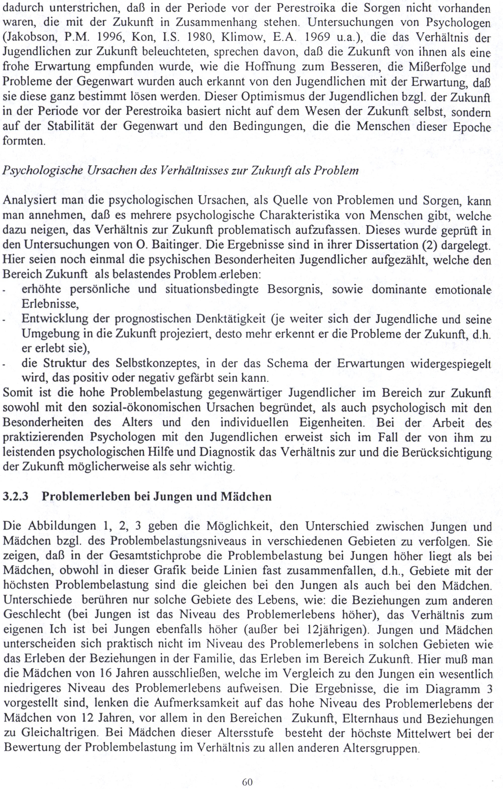 dadurch unterstrichen, daß in der Periode vor der Perestroika die Sorgen nicht vorhanden waren, die mit der Zukunft in Zusammenhang stehen. Untersuchungen von Psychologen (Jakobson, P.M. 1996, Kon, IS. 1980, Klimow, E.A. 1969 u.a.), die das Verhältnis der Jugendlichen zur Zukunft beleuchteten, sprechen davon, daß die Zukunft von ihnen als eine frohe Erwartung empfunden wurde, wie die Hoffnung zum Besseren, die Mißerfolge und Probleme der Gegenwart wurden auch erkannt von den Jugendlichen mit der Erwartung, daß sie diese ganz bestimmt lösen werden. Dieser Optimismus der Jugendlichen bzgl. der Zukunft in der Periode vor der Perestroika basiert nicht auf dem Wesen der Zukunft selbst, sondern auf der Stabilität der Gegenwart und den Bedingungen, die die Menschen dieser Epoche formten.