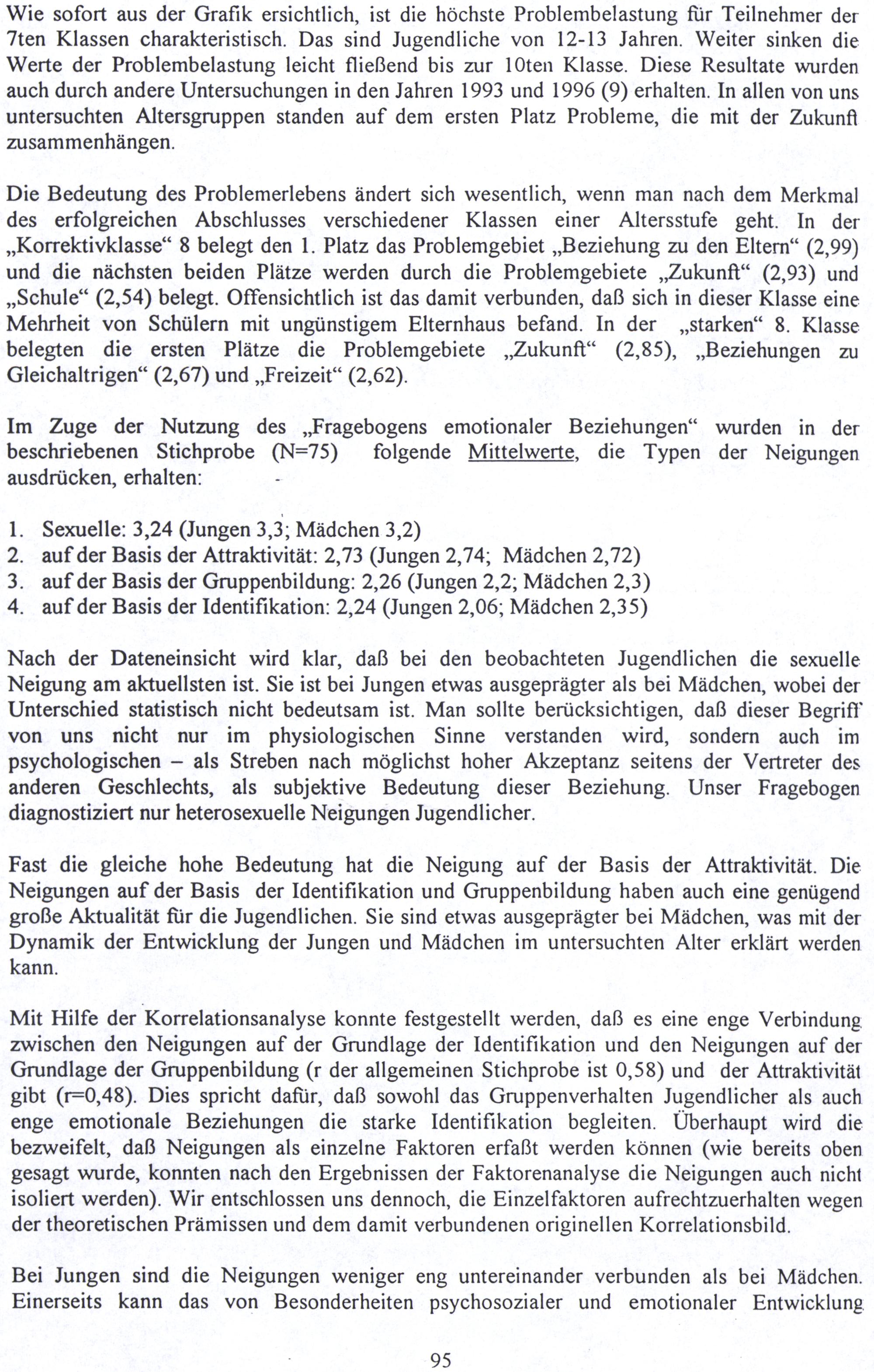 Wie sofort aus der Grafik ersichtlich, ist die höchste Problembelastung für Teilnehmer der 7ten Klassen charakteristisch. Das sind Jugendliche von 12-13 Jahren. Weiter sinken die Werte der Problembelastung leicht fließend bis zur 10ten Klasse. Diese Resultate wurden auch durch andere Untersuchungen in den Jahren 1993 und 1996(9) erhalten. In allen von uns untersuchten Altersgruppen standen auf dem ersten Platz Probleme, die mit der Zukunft zusammenhängen.