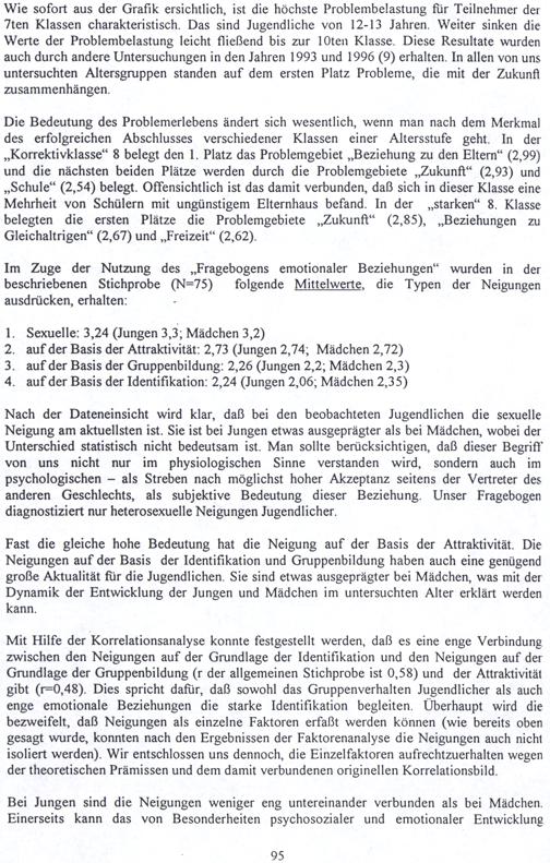 Nach der Dateneinsicht wird klar, daß bei den beobachteten Jugendlichen die sexuelle Neigung am aktuellsten ist. Sie ist bei Jungen etwas ausgeprägter als bei Mädchen, wobei der Unterschied statistisch nicht bedeutsam ist. Man sollte berücksichtigen, daß dieser Begriff von uns nicht nur im physiologischen Sinne verstanden wird, sondern auch im psychologischen— als Streben nach möglichst hoher Akzeptanz seitens der Vertreter des anderen Geschlechts, als subjektive Bedeutung dieser Beziehung. Unser Fragebogen diagnostiziert nur heterosexuelle Neigungen Jugendlicher.