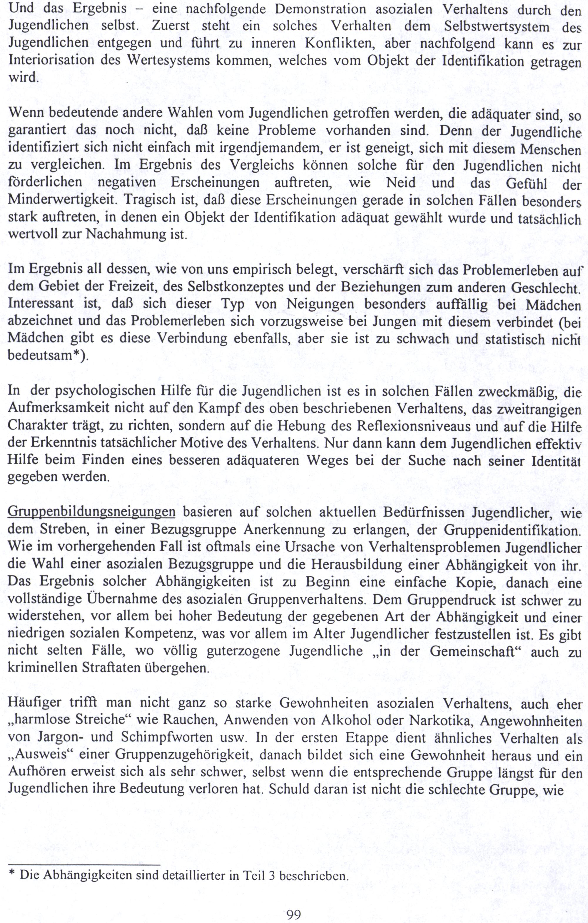 Gruppenbildungsneigungen basieren auf solchen aktuellen Bedürfnissen Jugendlicher, wie dem Streben, in einer Bezugsgruppe Anerkennung zu erlangen, der Gruppenidentifikation. Wie im vorhergehenden Fall ist oftmals eine Ursache von Verhaltensproblemen Jugendlicher die Wahl einer asozialen Bezugsgruppe und die Herausbildung einer Abhängigkeit von ihr. Das Ergebnis solcher Abhängigkeiten ist zu Beginn eine einfache Kopie, danach eine vollständige Übernahme des asozialen Gruppenverhaltens. Dem Gruppendruck ist schwer zu widerstehen, vor allem bei hoher Bedeutung der gegebenen Art der Abhängigkeit und einer niedrigen sozialen Kompetenz, was vor allem im Alter Jugendlicher festzustellen ist. Es gibt nicht selten Fälle, wo völlig guterzogene Jugendliche„in der Gemeinschaft“ auch zu kriminellen Straftaten übergehen.