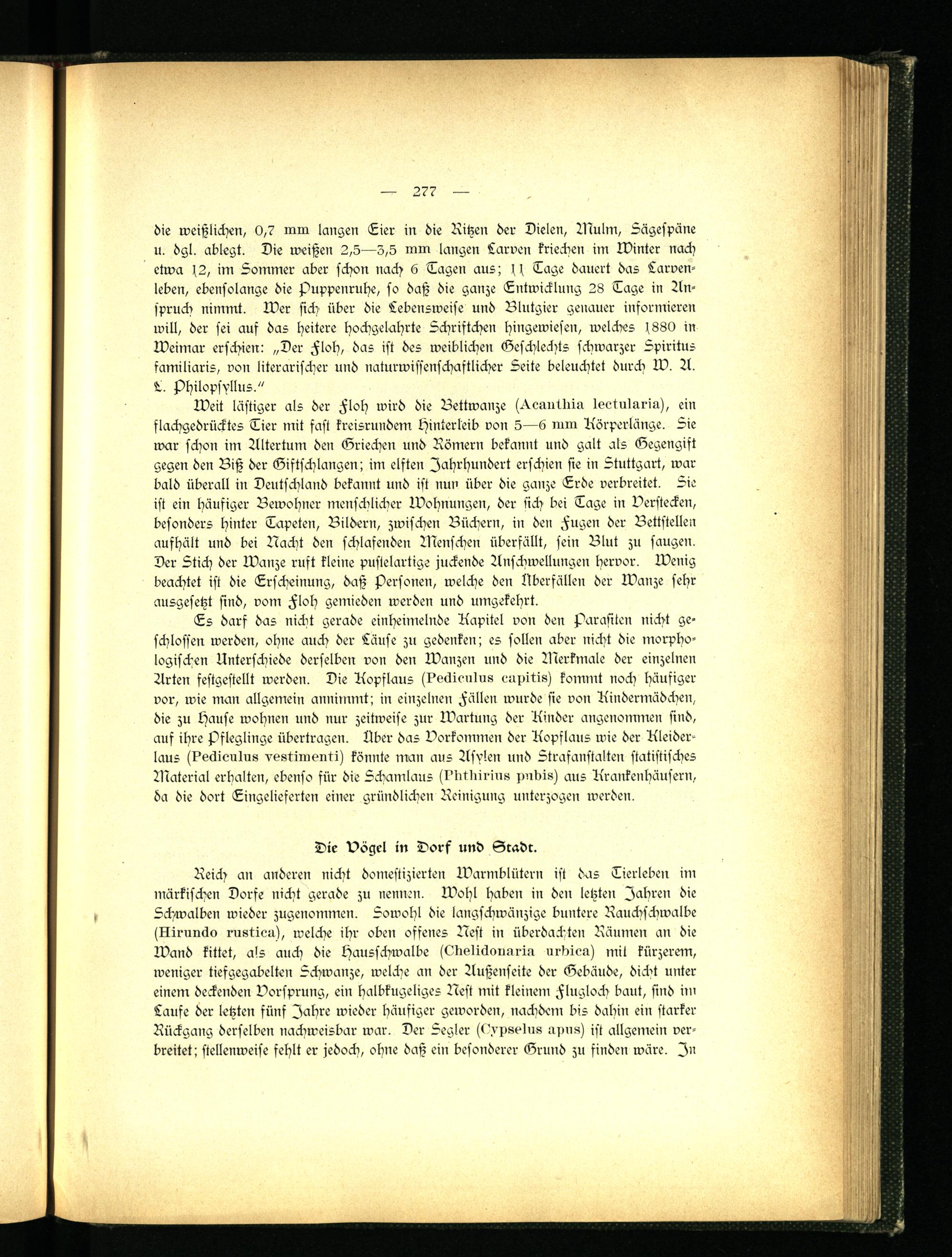 die weißlichen, 0,7 nun langen Eier in die Ritzen der Dielen, Wulm, Sägespäne u. dgl. ablegt. Die weißen 2,5—5,5 nun langen Larven kriechen im N)inter nach etwa 1,2, im Sommer aber schon nach 6 Tagen aus; > I Tage dauert das Laroen- leben, ebensolange die f)uppenruhe, so daß die ganze Entwicklung 28 Tage in Anspruch nimmt. Wer sich über die Lebensweise und Blutgier genauer informieren will, der sei auf das heitere hochgelahrte Schriftchen hingewiesen, welches If880 in Weimar erschien: „Der Floh, das ist des weiblichen Geschlechts schwarzer Spiritus familiaris, von literarischer und naturwissenschaftlicher Seite beleuchtet durch W. A. L. jDhilopsyllus."