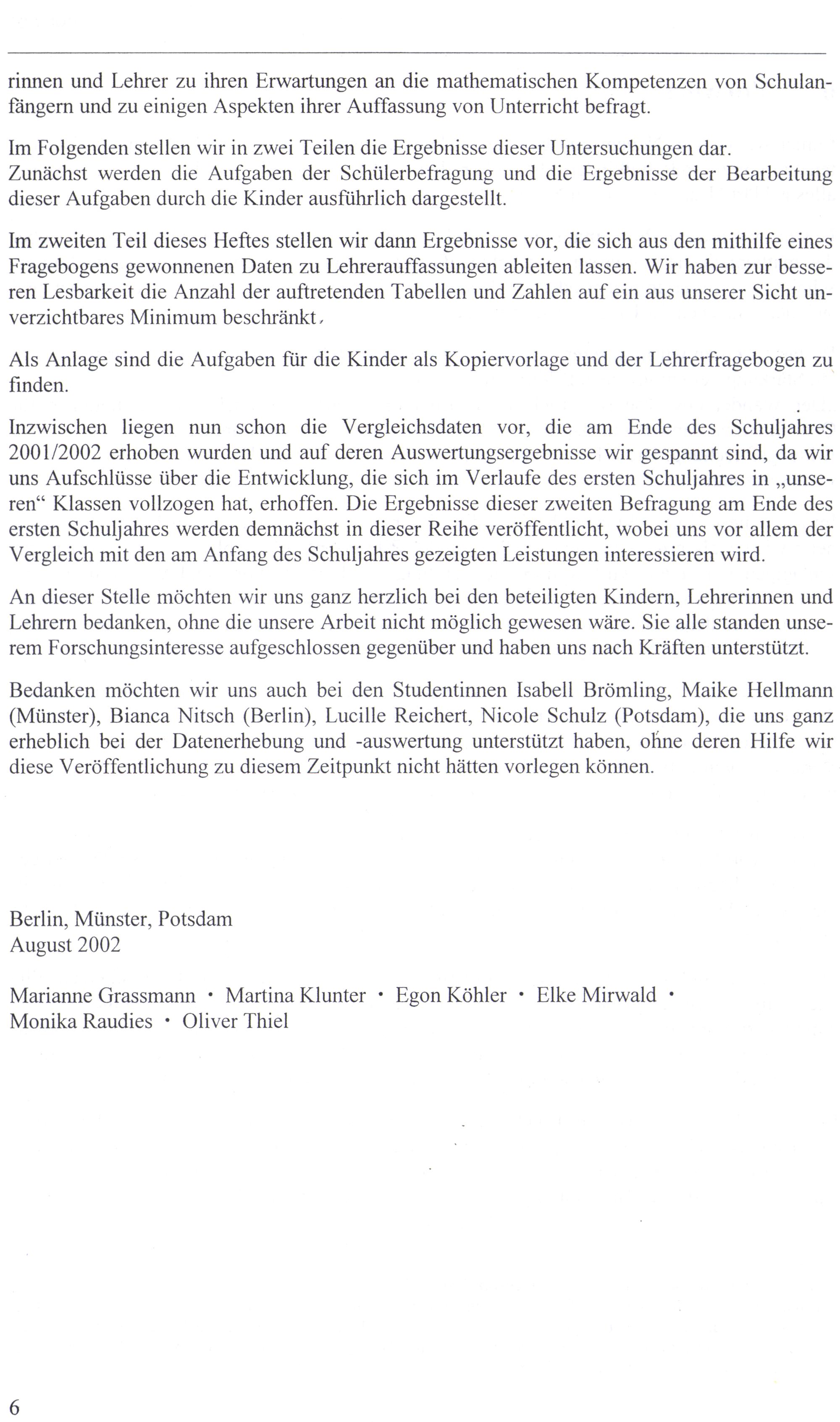 Bedanken möchten wir uns auch bei den Studentinnen Isabell Brömling, Maike Hellmann (Münster), Bianca Nitsch(Berlin), Lucille Reichert, Nicole Schulz(Potsdam), die uns ganz erheblich bei der Datenerhebung und-auswertung unterstützt haben, ohne deren Hilfe wir diese Veröffentlichung zu diesem Zeitpunkt nicht hätten vorlegen können.