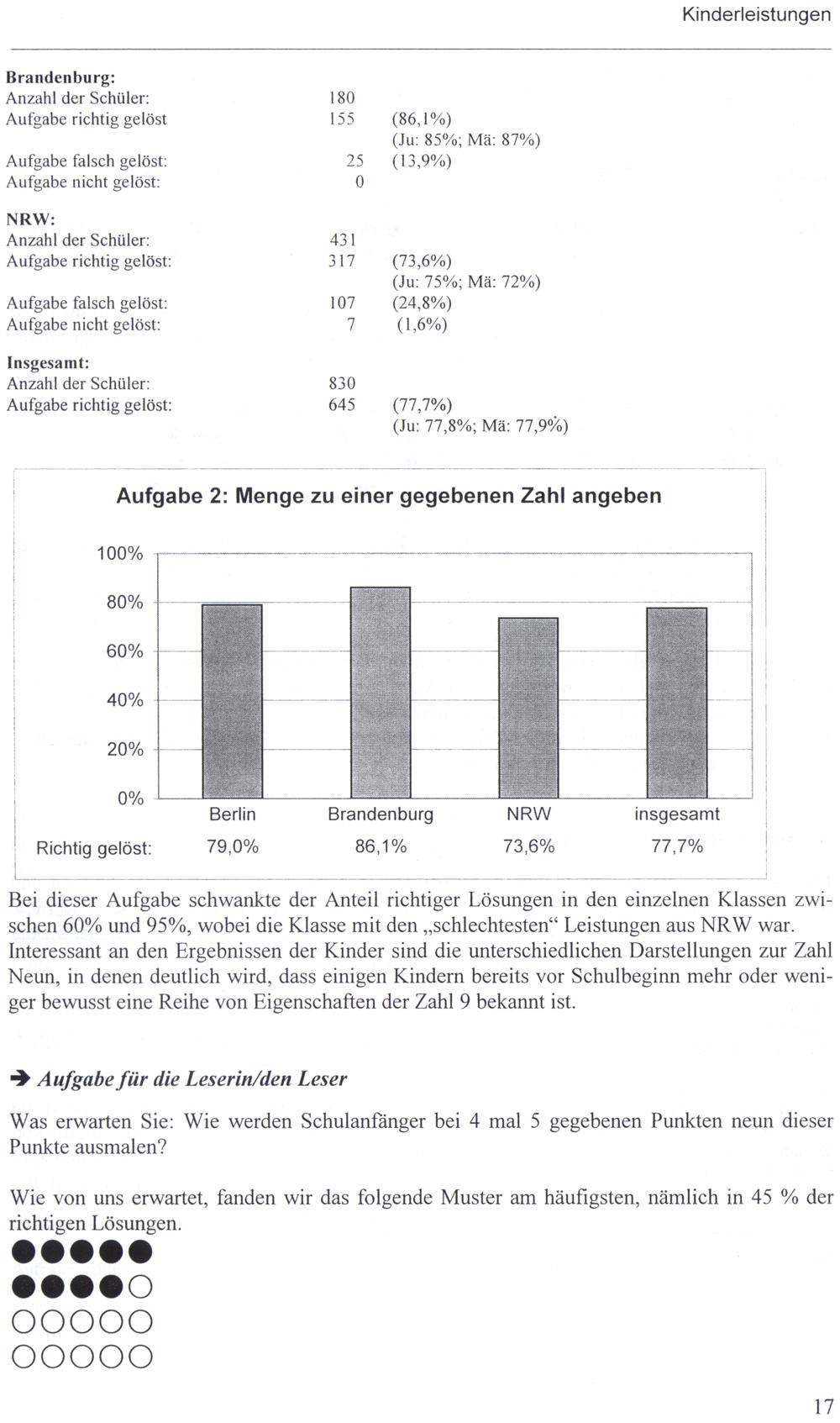 Bei dieser Aufgabe schwankte der Anteil richtiger Lösungen in den einzelnen Klassen zwischen 60% und 95%, wobei die Klasse mit den„schlechtesten“ Leistungen aus NRW war. Interessant an den Ergebnissen der Kinder sind die unterschiedlichen Darstellungen zur Zahl Neun, in denen deutlich wird, dass einigen Kindern bereits vor Schulbeginn mehr oder weniger bewusst eine Reihe von Eigenschaften der Zahl 9 bekannt ist.