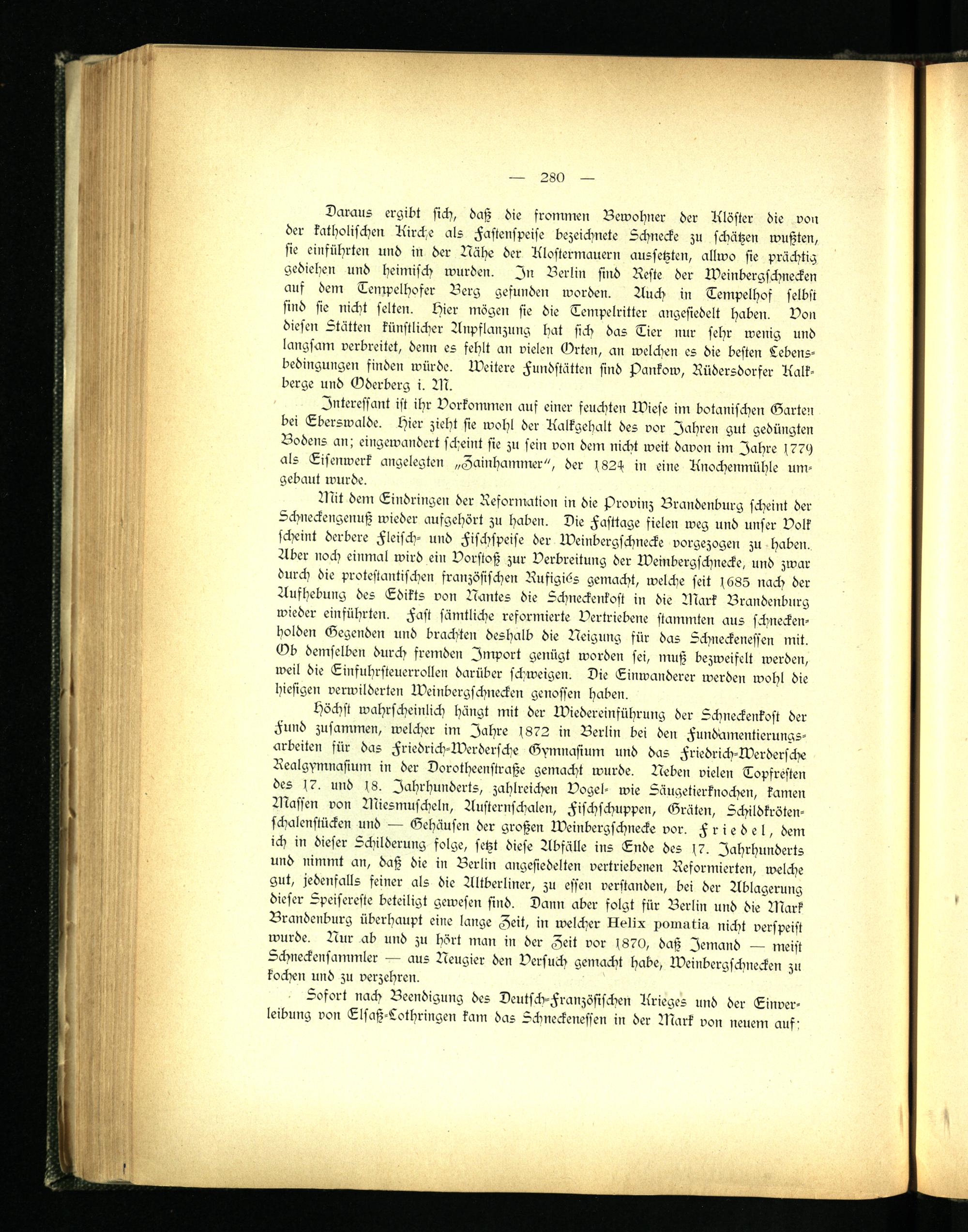 Daraus ergibt sich, daß die frommen Bewohner der Klöster die von der katholischen Kirche als Fastenspeise bezeichnete Schnecke zu schätzen wußten, sie einführten und in der Nähe der Klostermauern aussetzten, allwo sie prächtig gediehen und heimisch wurden, In Berlin sind Reste der Weinbergschnecken auf dem Tempelhofer Berg gefunden worden. Auch in Tempelhof selbst sind sie nicht selten, hier mögen sie die Tempelritter angesiedelt haben. Von diesen Stätten künstlicher Anpflanzung hat sich das Tier nur sehr wenig und langsam verbreitet, denn es fehlt an vielen Orten, an welchen es die besten Lebensbedingungen finden würde. Weitere Fundstätten sind jDankow, Rlldersdorfer Kalkberge und Oderberg i. Ak.
