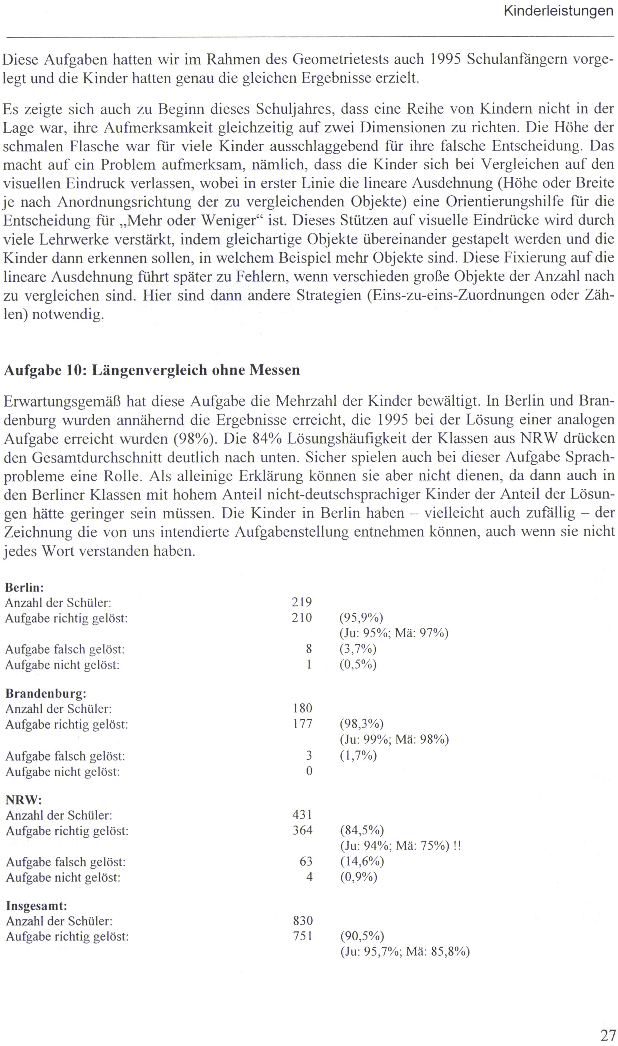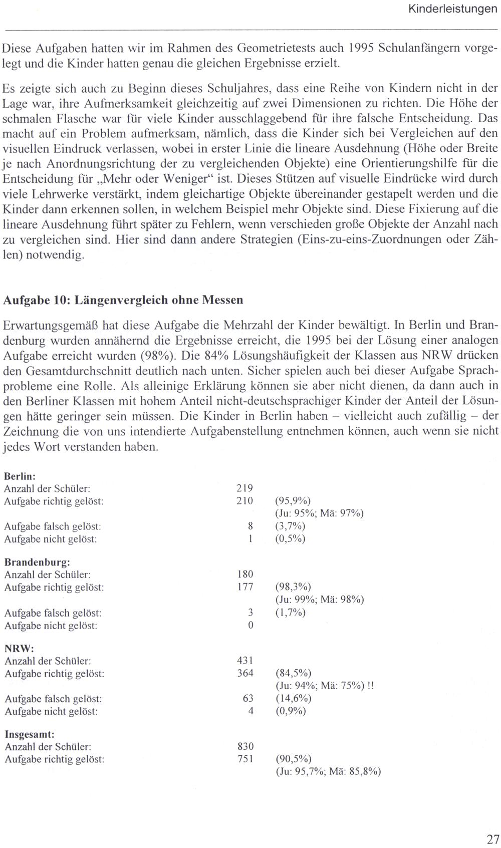 Berlin: Anzahl der Schüler: 219 Aufgabe richtig gelöst: 210(95,9%) (Ju: 95%; Mä: 97%) Aufgabe falsch gelöst: 8(3,7%) Aufgabe nicht gelöst:|(0,5%) Brandenburg: Anzahl der Schüler: 180 Aufgabe richtig gelöst: 177(98,3%) (Ju: 99%; Mä: 98%) Aufgabe falsch gelöst: 3(1,7%) Aufgabe nicht gelöst: 0 NRW: Anzahl der Schüler: 431 Aufgabe richtig gelöst: 364(84,5%) (Ju: 94%; Mä: 75%)!! Aufgabe falsch gelöst: 63(14,6%) Aufgabe nicht gelöst: 4(0,9%) Insgesamt: Anzahl der Schüler: 830 Aufgabe richtig gelöst: 751(90,5%)