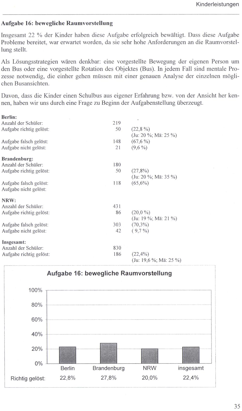 Berlin: Anzahl der Schüler: 219 Aufgabe richtig gelöst: 50(22,8%) (Ju: 20%; Mä: 25%) Aufgabe falsch gelöst: 1438(67,6%) Aufgabe nicht gelöst: 21(9,6%) Brandenburg: Anzahl der Schüler: 180 Aufgabe richtig gelöst: 50(27,8%) (Ju: 20%; Mä: 35%) Aufgabe falsch gelöst: 118(65,6%) Aufgabe nicht gelöst: NRW: Anzahl der Schüler: 431 Aufgabe richtig gelöst: 86(20,0%) (Ju: 19%; Mä: 21%) Aufgabe falsch gelöst: 303(70,3%) Aufgabe nicht gelöst: 42(9,7%) Insgesamt: Anzahl der Schüler: 830 Aufgabe richtig gelöst: 186(22,4%) (Ju: 19,6%; Mä: 25%) Aufgabe 16: bewegliche Raumvorstellung| | 100% 4 A E— ans eEt 80%|——; A} / 60% a m-/| | 40% 7-——— 20%=. Berlin Brandenburg NRW insgesamt| | __ Richtig gelöst: 22,8% 27,8% 20,0% 22,4%