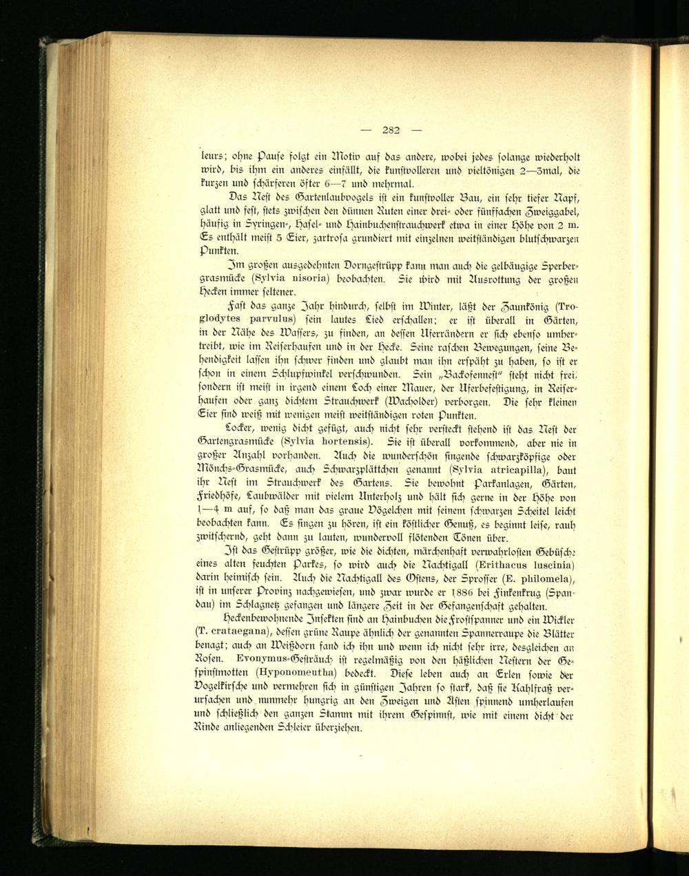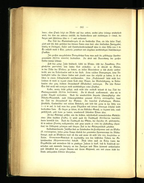 Locker, wenig dicht gefügt, auch nicht sehr versteckt stehend ist das Nest der Gartengrasmücke (Kvtvin boi-lensis). Sie ist überall vorkommend, aber nie in großer Anzahl vorhanden. Auch die wunderschön singende schwarzkäpsige oder Mönchs-Grasmücke, auch Schwarzplättchen genannt (Kelvin ntrieapilln), baut ihr Nest im Strauchwerk des Gartens. Sie bewobnt Parkanlagen, Gärten, Friedhöfe, Laubwälder mit vielem Unterholz und hält sich gerne in der Höhe von s—q. w auf, so daß man das graue Bögelchen mit seinem schwarzen Scheitel leicht beobachten kann. Gs singen zu hören, ist ein köstlicher Genuß, es beginnt leise, rauh zwitschernd, geht dann zu lauten, wundervoll flötenden Tönen über.