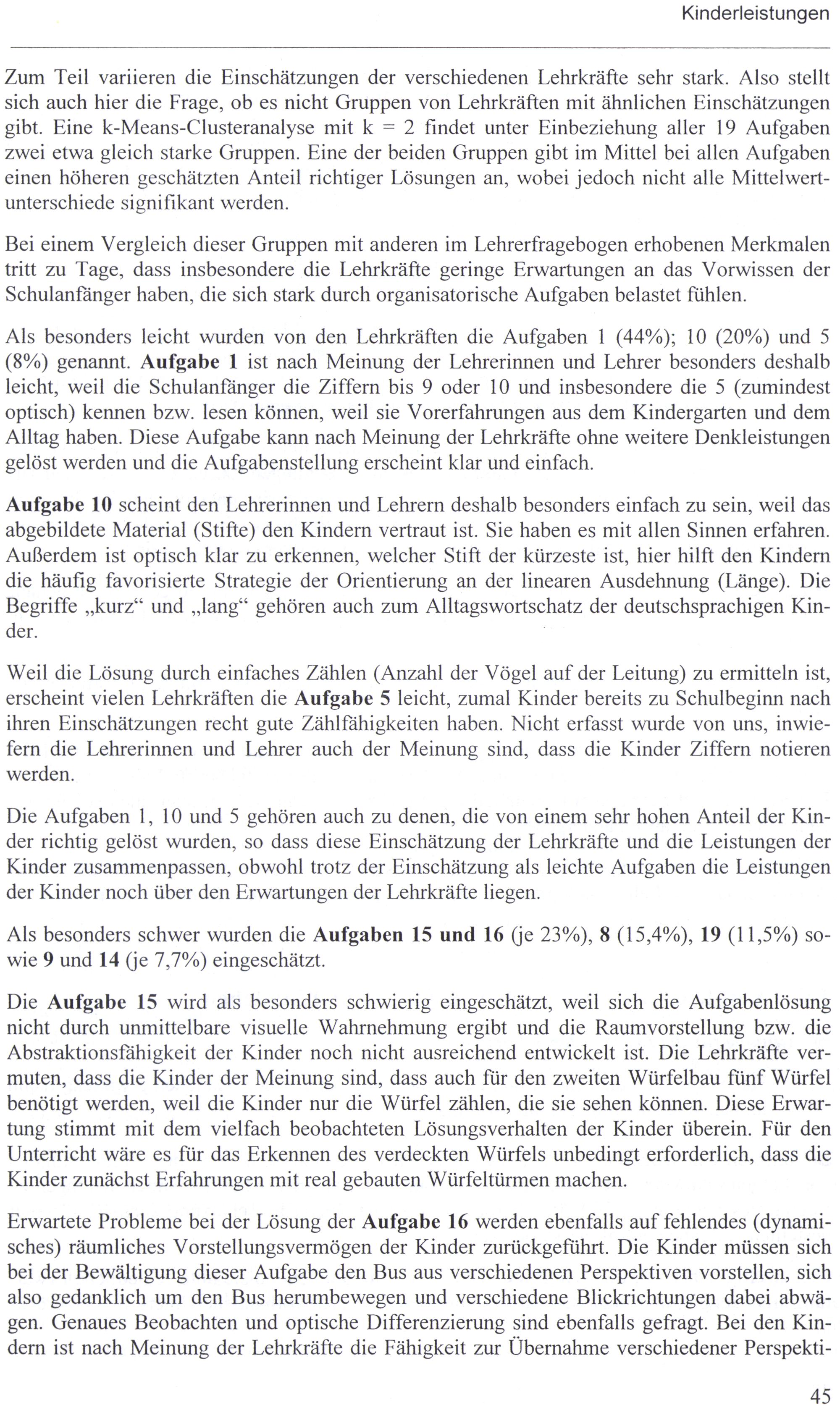 Die Aufgaben 1, 10 und 5 gehören auch zu denen, die von einem sehr hohen Anteil der Kinder richtig gelöst wurden, so dass diese Einschätzung der Lehrkräfte und die Leistungen der Kinder zusammenpassen, obwohl trotz der Einschätzung als leichte Aufgaben die Leistungen der Kinder noch über den Erwartungen der Lehrkräfte liegen.
