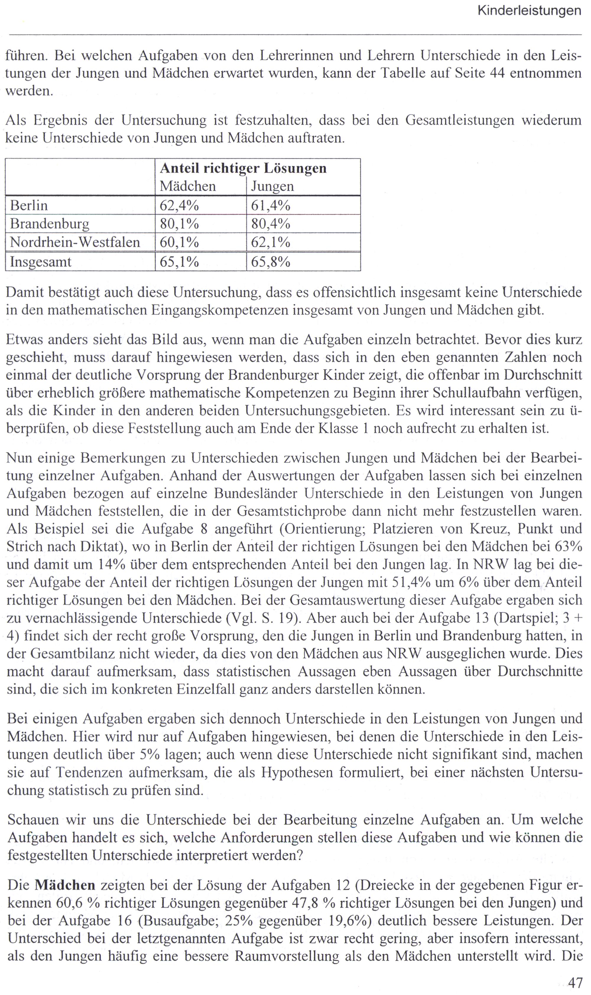 Nun einige Bemerkungen zu Unterschieden zwischen Jungen und Mädchen bei der Bearbeitung einzelner Aufgaben. Anhand der Auswertungen der Aufgaben lassen sich bei einzelnen Aufgaben bezogen auf einzelne Bundesländer Unterschiede in den Leistungen von Jungen und Mädchen feststellen, die in der Gesamtstichprobe dann nicht mehr festzustellen waren. Als Beispiel sei die Aufgabe 8 angeführt(Orientierung; Platzieren von Kreuz, Punkt und Strich nach Diktat), wo in Berlin der Anteil der richtigen Lösungen bei den Mädchen bei 63% und damit um 14% über dem entsprechenden Anteil bei den Jungen lag. In NRW lag beı dieser Aufgabe der Anteil der richtigen Lösungen der Jungen mit 51,4% um 6% über dem Anteil richtiger Lösungen bei den Mädchen. Bei der Gesamtauswertung dieser Aufgabe ergaben sich zu vernachlässigende Unterschiede(Vgl. S. 19). Aber auch bei der Aufgabe 13(Dartspiel; 3+ 4) findet sich der recht große Vorsprung, den die Jungen in Berlin und Brandenburg hatten, in der Gesamtbilanz nicht wieder, da dies von den Mädchen aus NRW ausgeglichen wurde. Dies macht darauf aufmerksam, dass statistischen Aussagen eben Aussagen über Durchschnitte sind, die sich im konkreten Einzelfall ganz anders darstellen können.