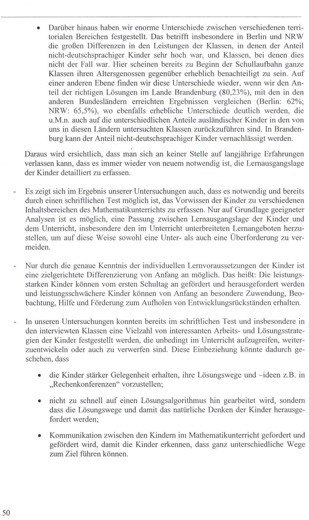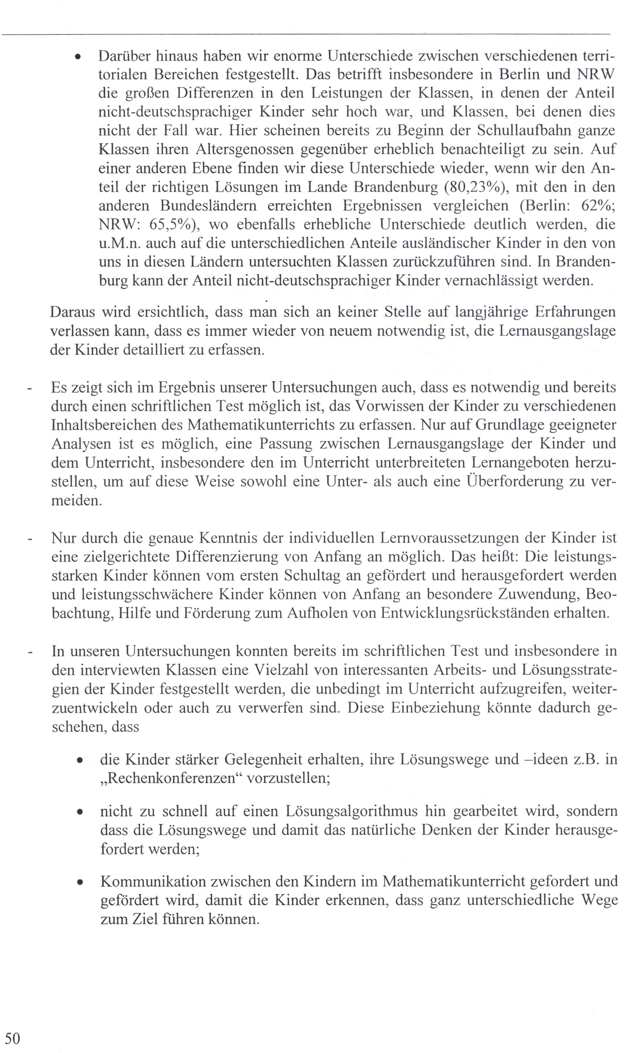 e Darüber hinaus haben wir enorme Unterschiede zwischen verschiedenen territorialen Bereichen festgestellt. Das betrifft insbesondere in Berlin und NRW die großen Differenzen in den Leistungen der Klassen, in denen der Anteil nicht-deutschsprachiger Kinder sehr hoch war, und Klassen, bei denen dies nicht der Fall war. Hier scheinen bereits zu Beginn der Schullaufbahn ganze Klassen ihren Altersgenossen gegenüber erheblich benachteiligt zu sein. Auf einer anderen Ebene finden wir diese Unterschiede wieder, wenn wir den Anteil der richtigen Lösungen im Lande Brandenburg(80,23%), mit den in den anderen Bundesländern erreichten Ergebnissen vergleichen(Berlin: 62%; NRW: 65,5%), wo ebenfalls erhebliche Unterschiede deutlich werden, die u.M.n. auch auf die unterschiedlichen Anteile ausländischer Kinder in den von uns in diesen Ländern untersuchten Klassen zurückzuführen sind. In Brandenburg kann der Anteil nicht-deutschsprachiger Kinder vernachlässigt werden.