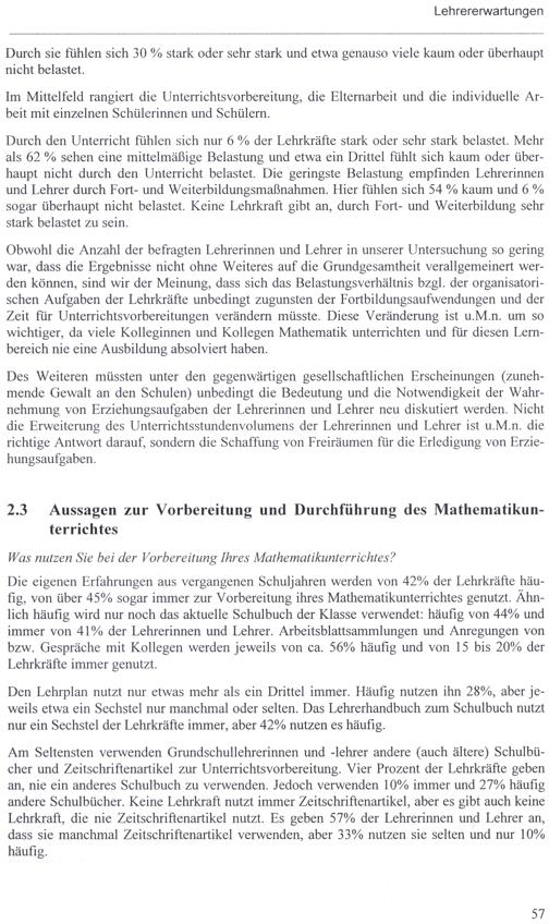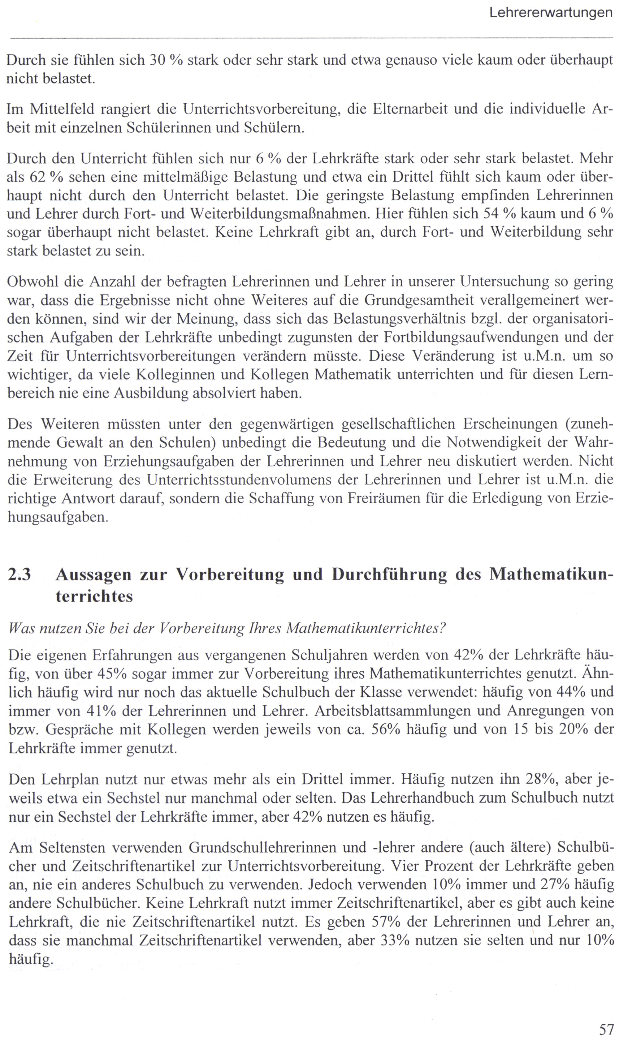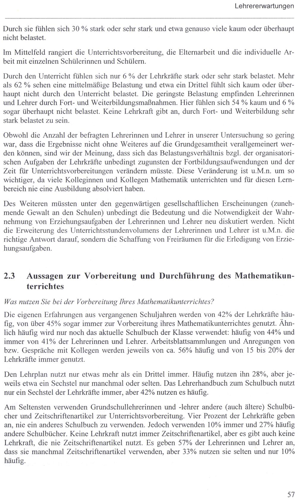 Obwohl die Anzahl der befragten Lehrerinnen und Lehrer in unserer Untersuchung so gering war, dass die Ergebnisse nicht ohne Weiteres auf die Grundgesamtheit verallgemeinert werden können, sind wir der Meinung, dass sich das Belastungsverhältnis bzgl. der organisatorischen Aufgaben der Lehrkräfte unbedingt zugunsten der Fortbildungsaufwendungen und der Zeit für Unterrichtsvorbereitungen verändern müsste. Diese Veränderung ist u.M.n. um so wichtiger, da viele Kolleginnen und Kollegen Mathematik unterrichten und für diesen Lernbereich nie eine Ausbildung absolviert haben.