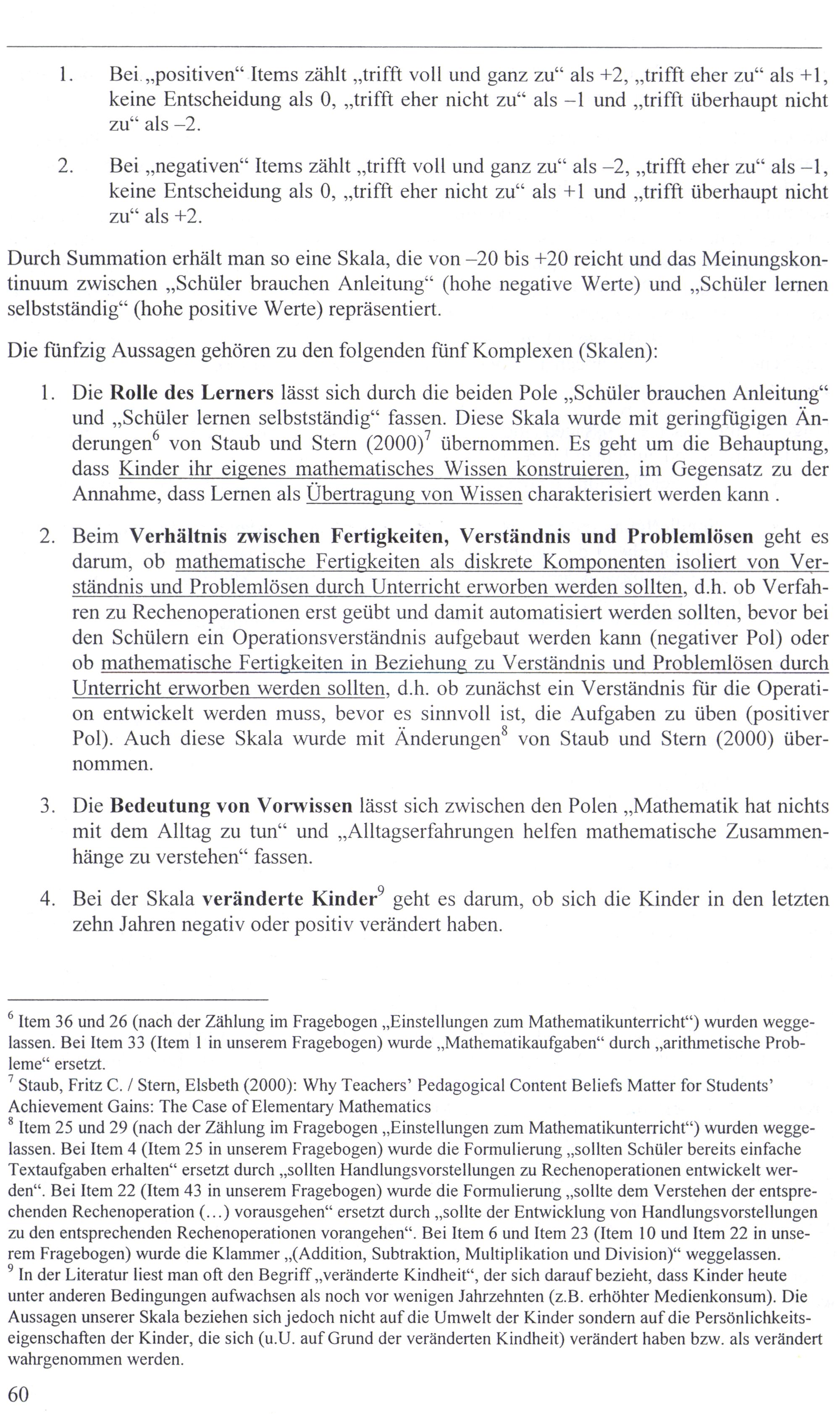 ren zu Rechenoperationen erst geübt und damit automatisiert werden sollten, bevor bei den Schülern ein Operationsverständnis aufgebaut werden kann(negativer Pol) oder ob mathematische Fertigkeiten in Beziehung zu Verständnis und Problemlösen durch Unterricht erworben werden sollten, d.h. ob zunächst ein Verständnis für die Operation entwickelt werden muss, bevor es sinnvoll ist, die Aufgaben zu üben(positiver Pol). Auch diese Skala wurde mit Änderungen” von Staub und Stern(2000) übernommen.