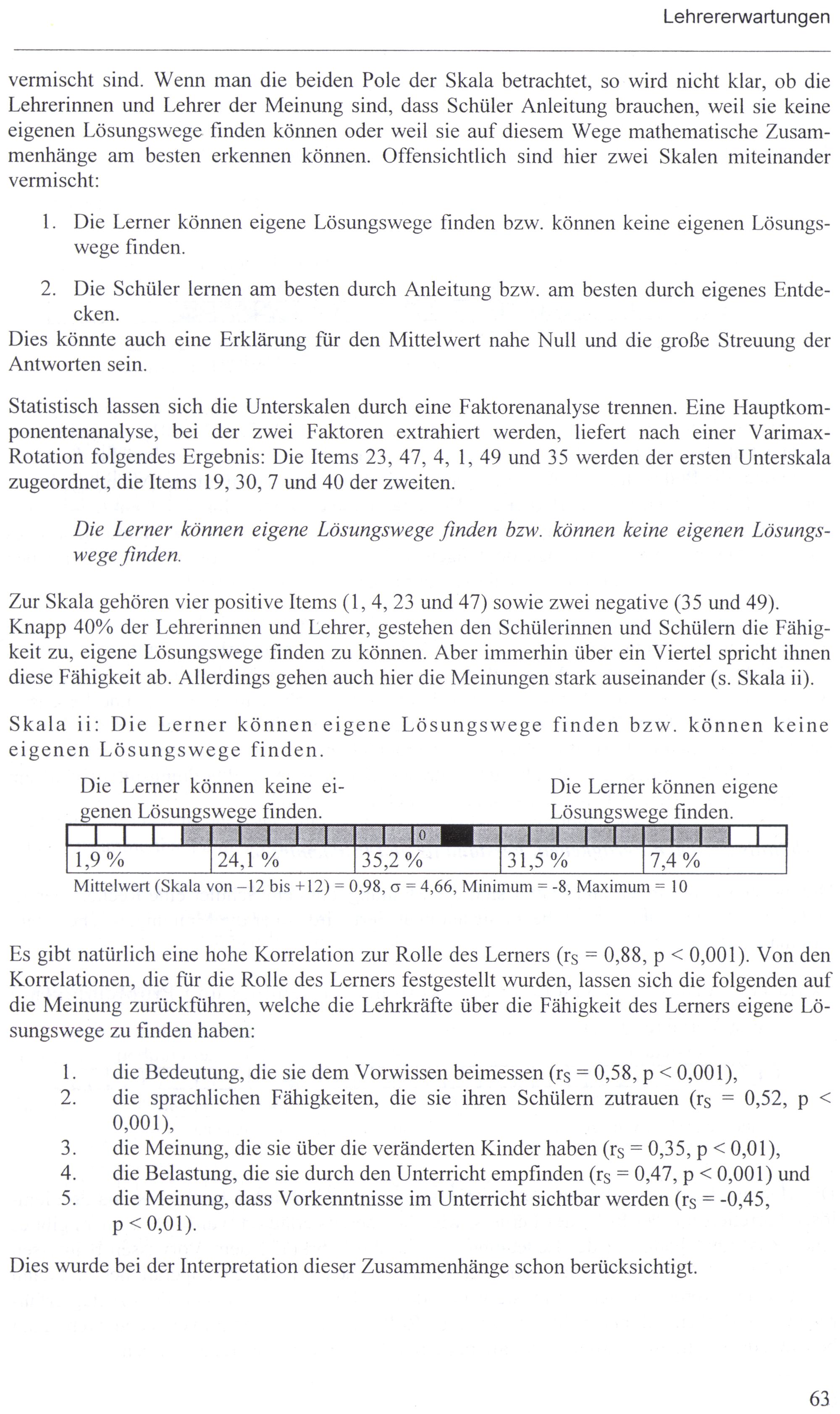 vermischt sind. Wenn man die beiden Pole der Skala betrachtet, so wird nicht klar, ob die Lehrerinnen und Lehrer der Meinung sind, dass Schüler Anleitung brauchen, weil sie keine eigenen Lösungswege finden können oder weil sie auf diesem Wege mathematische Zusammenhänge am besten erkennen können. Offensichtlich sind hier zwei Skalen miteinander vermischt: