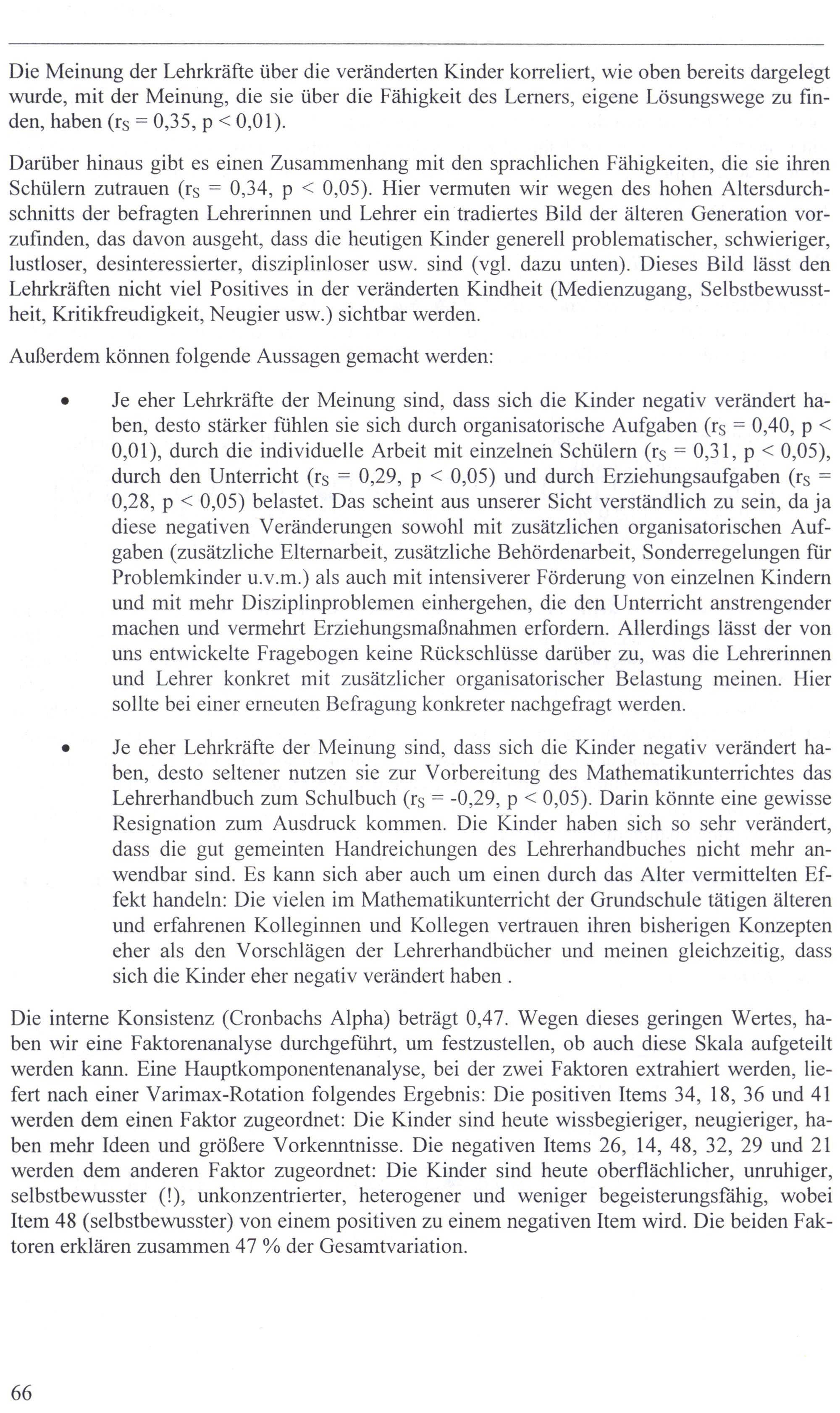 # Je eher Lehrkräfte der Meinung sind, dass sich die Kinder negativ verändert haben, desto seltener nutzen sie zur Vorbereitung des Mathematikunterrichtes das Lehrerhandbuch zum Schulbuch(rs=-0,29, p< 0,05). Darın könnte eine gewisse Resignation zum Ausdruck kommen. Die Kinder haben sich so sehr verändert, dass die gut gemeinten Handreichungen des Lehrerhandbuches nicht mehr anwendbar sind. Es kann sich aber auch um einen durch das Alter vermittelten Effekt handeln: Die vielen im Mathematikunterricht der Grundschule tätigen älteren und erfahrenen Kolleginnen und Kollegen vertrauen ihren bisherigen Konzepten eher als den Vorschlägen der Lehrerhandbücher und meinen gleichzeitig, dass sich die Kinder eher negativ verändert haben.