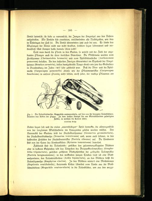Fig. 2. Oie Rosenblattwespe, lVlegsckile centuneulsris, auf den von ihr benagten Rosenblättern. Daneben das Rokon der Puppe. In dem hohlen Stengel die aus Blattabschnitten gefertigten