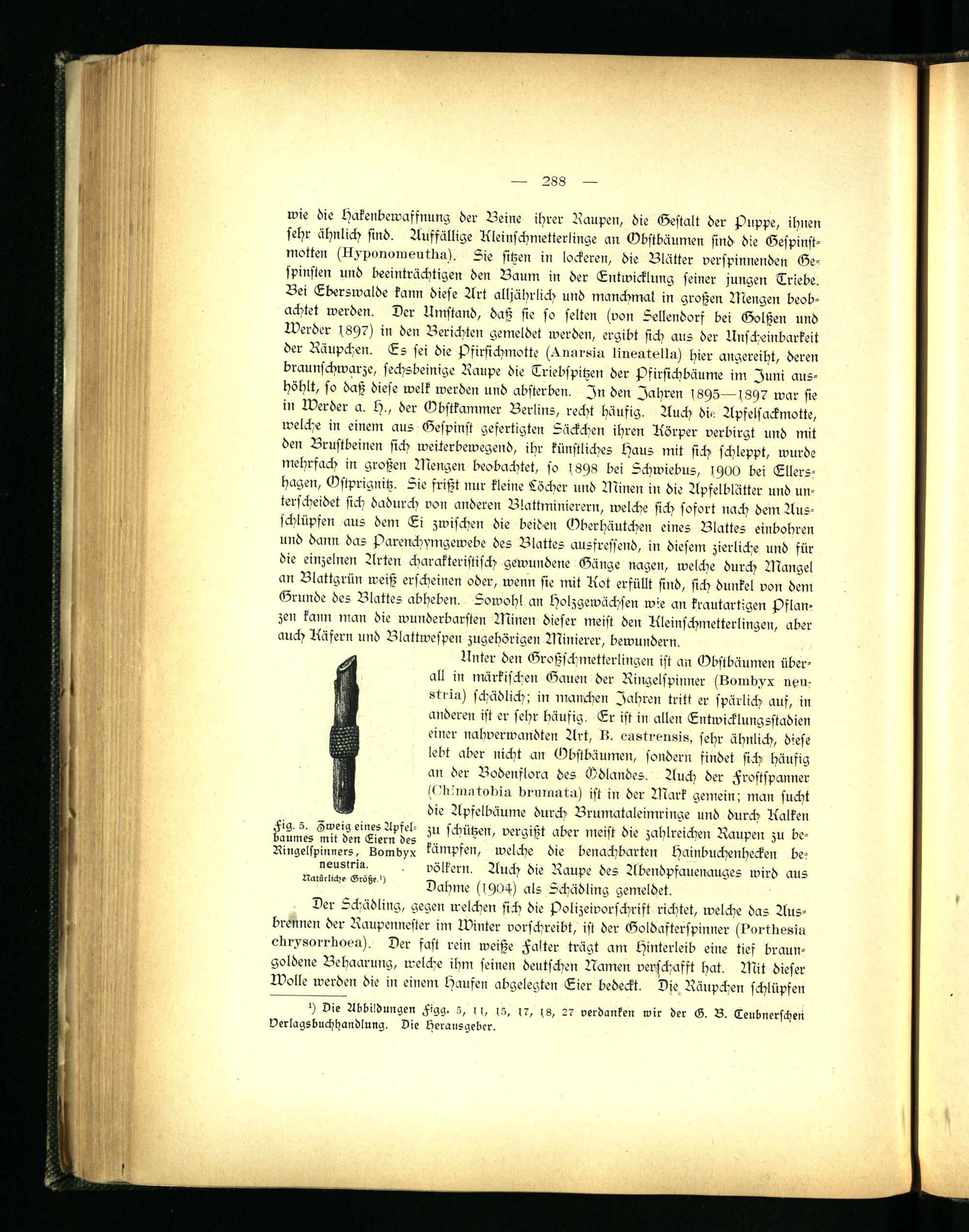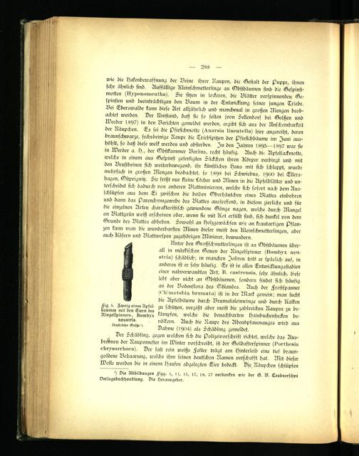 Der Schädling, gegen welchen sich die Polizeivorschrift richtet, welche das Ausbrennen der Raupennester im Winter vorschreibt, ist der Goldafterspinner (I'vrtlwsiu obrysorrlloea). Der fast rein weiße Falter trägt am Hinterleib eine tief braungoldene Behaarung, welche ihm feinen deutschen Namen verschafft hat. Mit dieser Wolle werden die in einem Haufen abgelegten Eier bedeckt. Die Räupchen schlüpfen