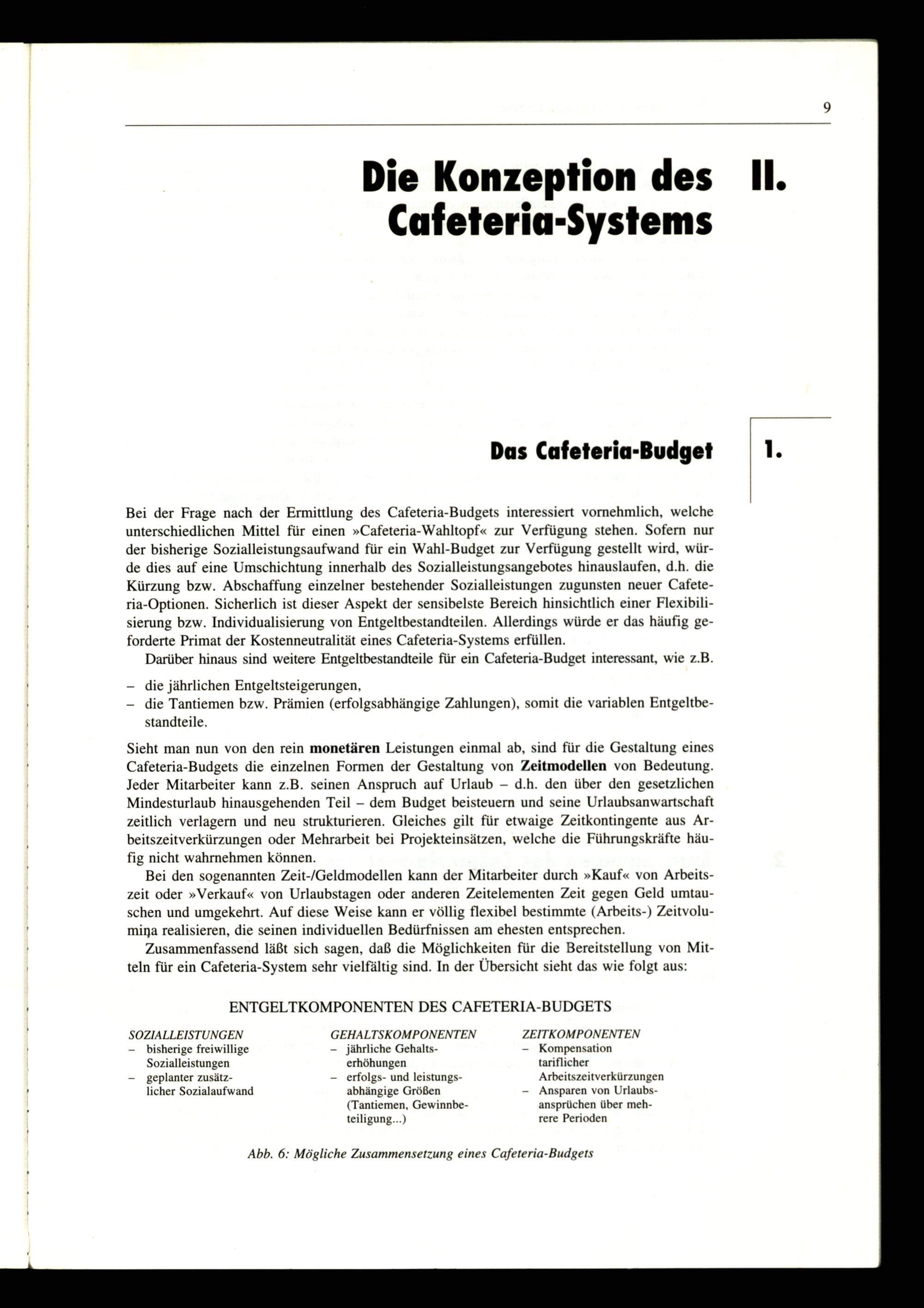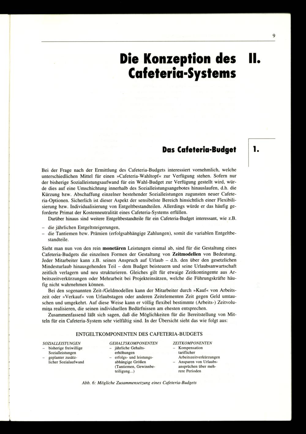 Bei der Frage nach der Ermittlung des Cafeteria-Budgets interessiert vornehmlich, welche unterschiedlichen Mittel für einen»Cafeteria-Wahltopf« zur Verfügung stehen. Sofern nur der bisherige Sozialleistungsaufwand für ein Wahl-Budget zur Verfügung gestellt wird, würde dies auf eine Umschichtung innerhalb des Sozialleistungsangebotes hinauslaufen, d.h. die Kürzung bzw. Abschaffung einzelner bestehender Sozialleistungen zugunsten neuer Cafeteria-Optionen. Sicherlich ist dieser Aspekt der sensibelste Bereich hinsichtlich einer Flexibilisierung bzw. Individualisierung von Entgeltbestandteilen. Allerdings würde er das häufig geforderte Primat der Kostenneutralität eines Cafeteria-Systems erfüllen.