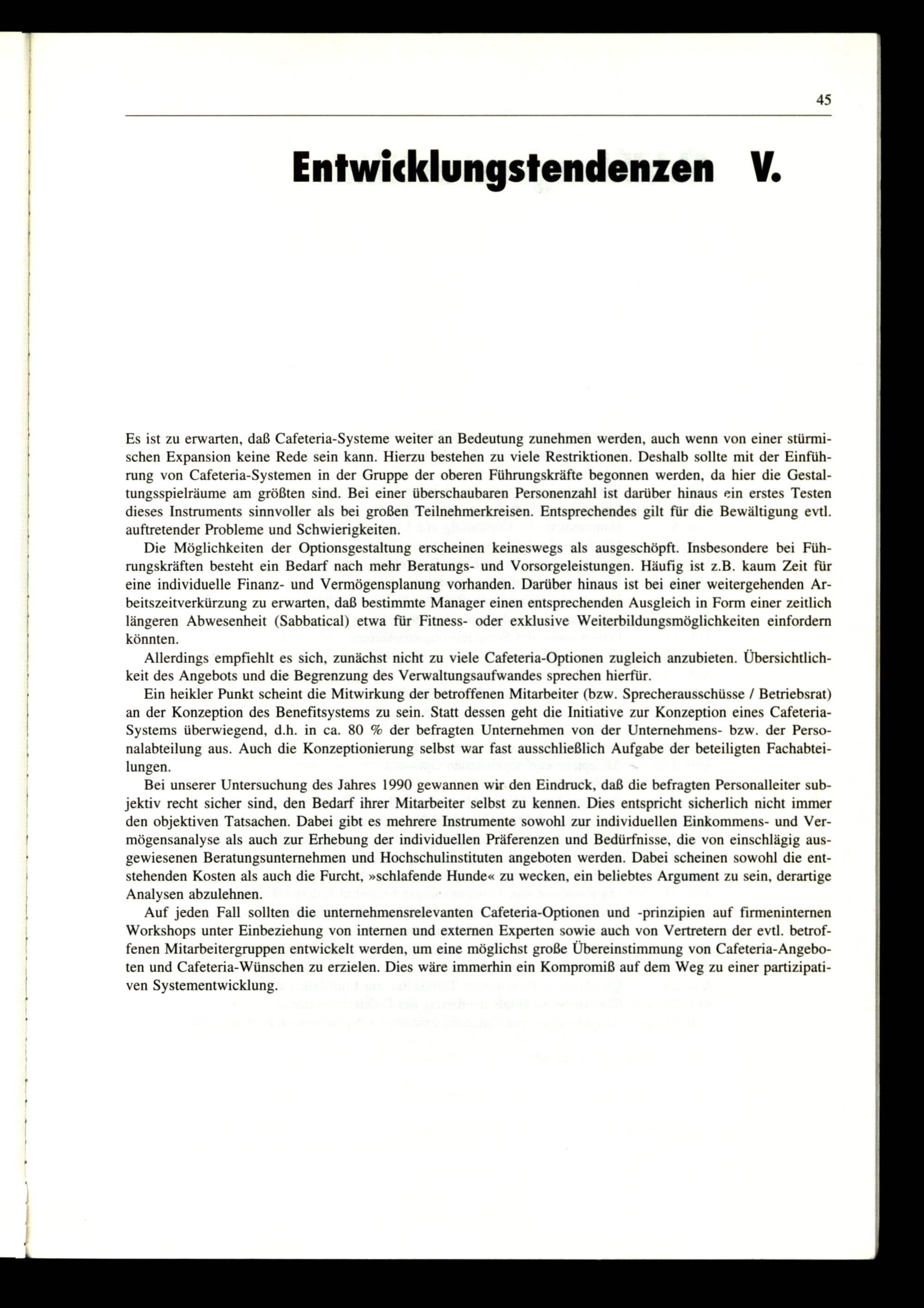 Auf jeden Fall sollten die unternehmensrelevanten Cafeteria-Optionen und-prinzipien auf firmeninternen Workshops unter Einbeziehung von internen und externen Experten sowie auch von Vertretern der evtl. betroffenen Mitarbeitergruppen entwickelt werden, um eine möglichst große Übereinstimmung von Cafeteria-Angeboten und Cafeteria-Wünschen zu erzielen. Dies wäre immerhin ein Kompromiß auf dem Weg zu einer partizipativen Systementwicklung.