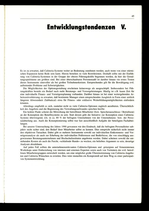 Es ist zu erwarten, daß Cafeteria-Systeme weiter an Bedeutung zunehmen werden, auch wenn von einer stürmischen Expansion keine Rede sein kann. Hierzu bestehen zu viele Restriktionen. Deshalb sollte mit der Einführung von Cafeteria-Systemen in der Gruppe der oberen Führungskräfte begonnen werden, da hier die Gestaltungsspielräume am größten sind. Bei einer überschaubaren Personenzahl ist darüber hinaus ein erstes Testen dieses Instruments sinnvoller als bei großen Teilnehmerkreisen. Entsprechendes gilt für die Bewältigung evtl. auftretender Probleme und Schwierigkeiten.