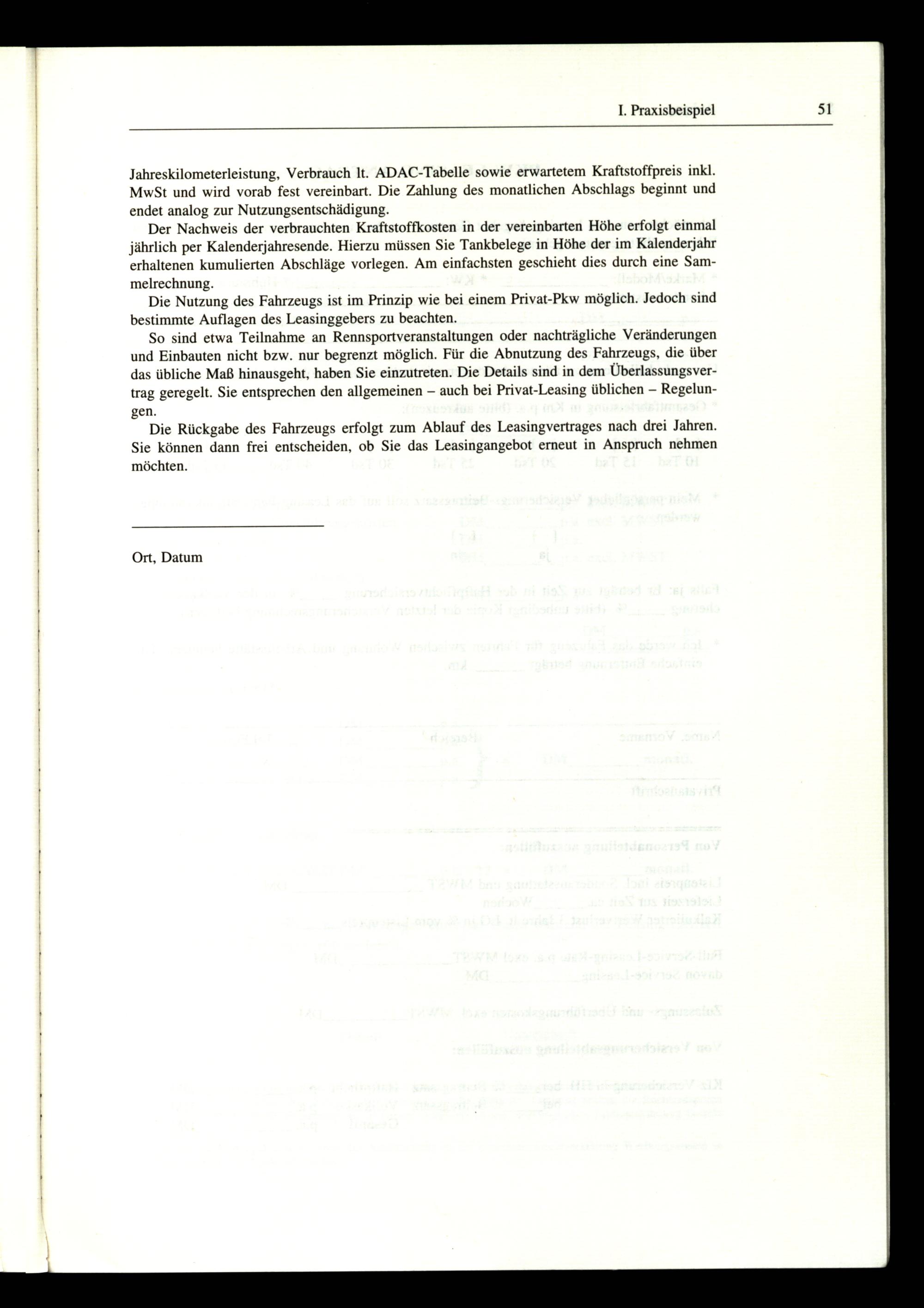 So sind etwa Teilnahme an Rennsportveranstaltungen oder nachträgliche Veränderungen und Einbauten nicht bzw. nur begrenzt möglich. Für die Abnutzung des Fahrzeugs, die über das übliche Maß hinausgeht, haben Sie einzutreten. Die Details sind in dem Überlassungsvertrag geregelt. Sie entsprechen den allgemeinen— auch bei Privat-Leasing üblichen— Regelungen.