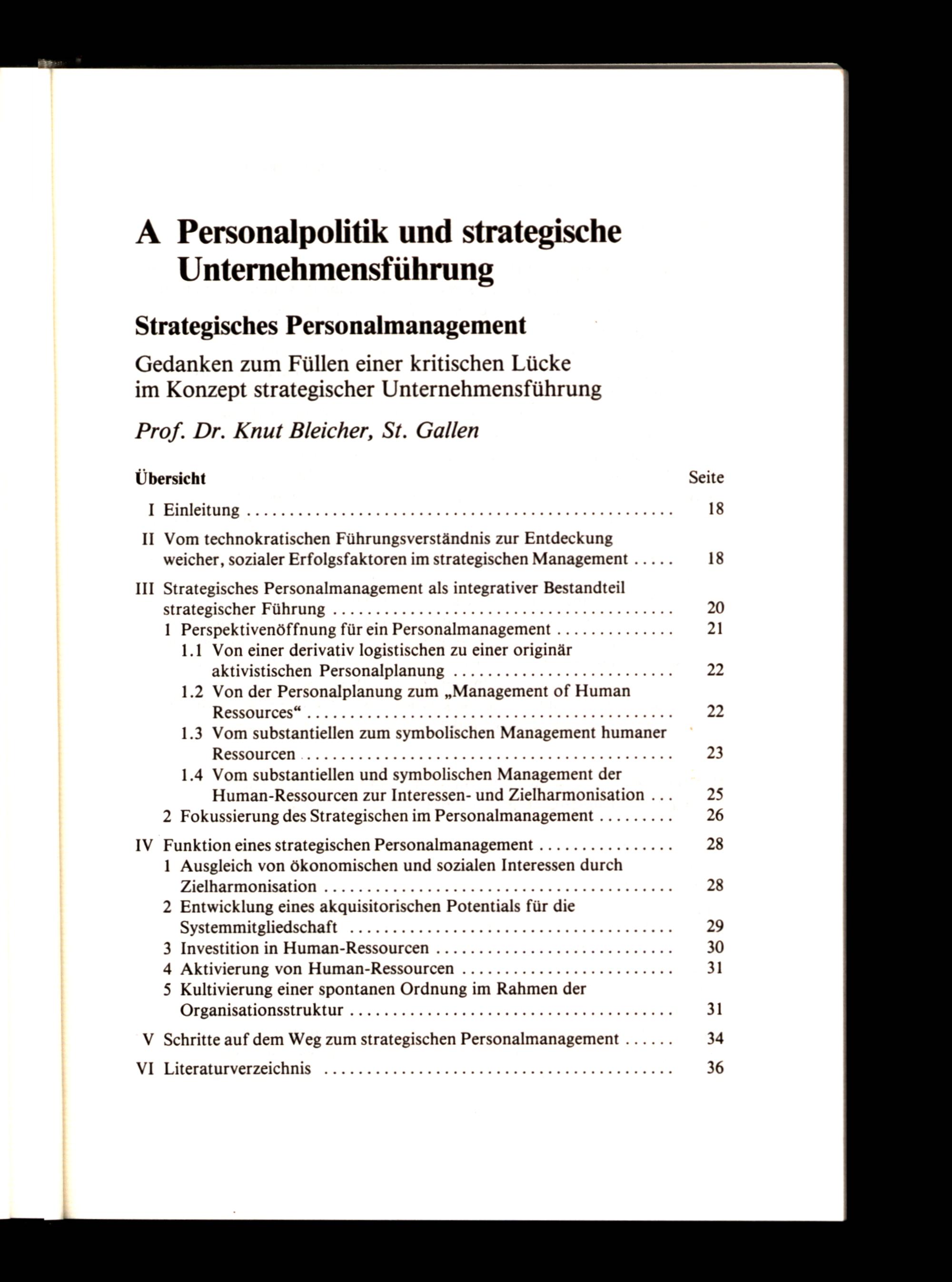 Übersicht Seite I EinleituNß II Vom technokratischen Führungsverständnis zur Entdeckung weicher, sozialer Erfolgsfaktoren im strategischen Management. III Strategisches Personalmanagement als integrativer Bestandteil strategischer Führung 1 Perspektivenöffnung für ein Personalmanagement 1.1 Von einer derivativ logistischen zu einer originär aktivistischen Personalplanung. 1.2 Von der Personalplanung zum„Management of Human RessÖUrceS” er ireenRE TEHERAN 1.3 Vom substantiellen zum symbolischen Management humaner RessOUCeN+ er RE EG 1.4 Vom substantiellen und symbolischen Management der Human-Ressourcen zur Interessen- und Zielharmonisation 2 Fokussierung des Strategischen im Personalmanagement IV Funktion eines strategischen Personalmanagement. 1 Ausgleich von ökonomischen und sozialen Interessen durch ZielharmonisatiON 2 Entwicklung eines akquisitorischen Potentials für die Systemmitgliedschaft. 3 Investition in Human-Ressourcen 4 Aktivierung von Human-Ressourcen. 5 Kultivierung einer spontanen Ordnung im Rahmen der Organisationsstruktur V Schritte auf dem Weg zum strategischen Personalmanagement.
